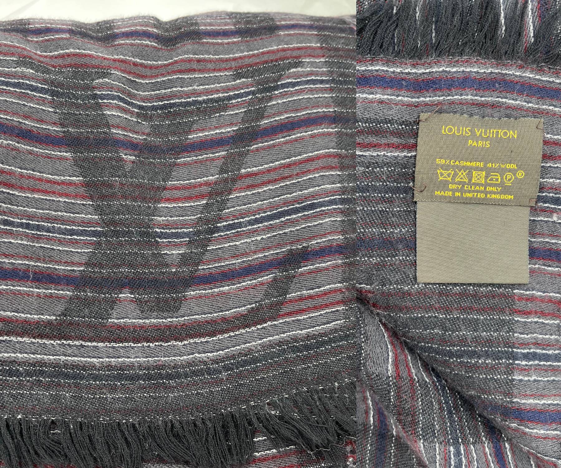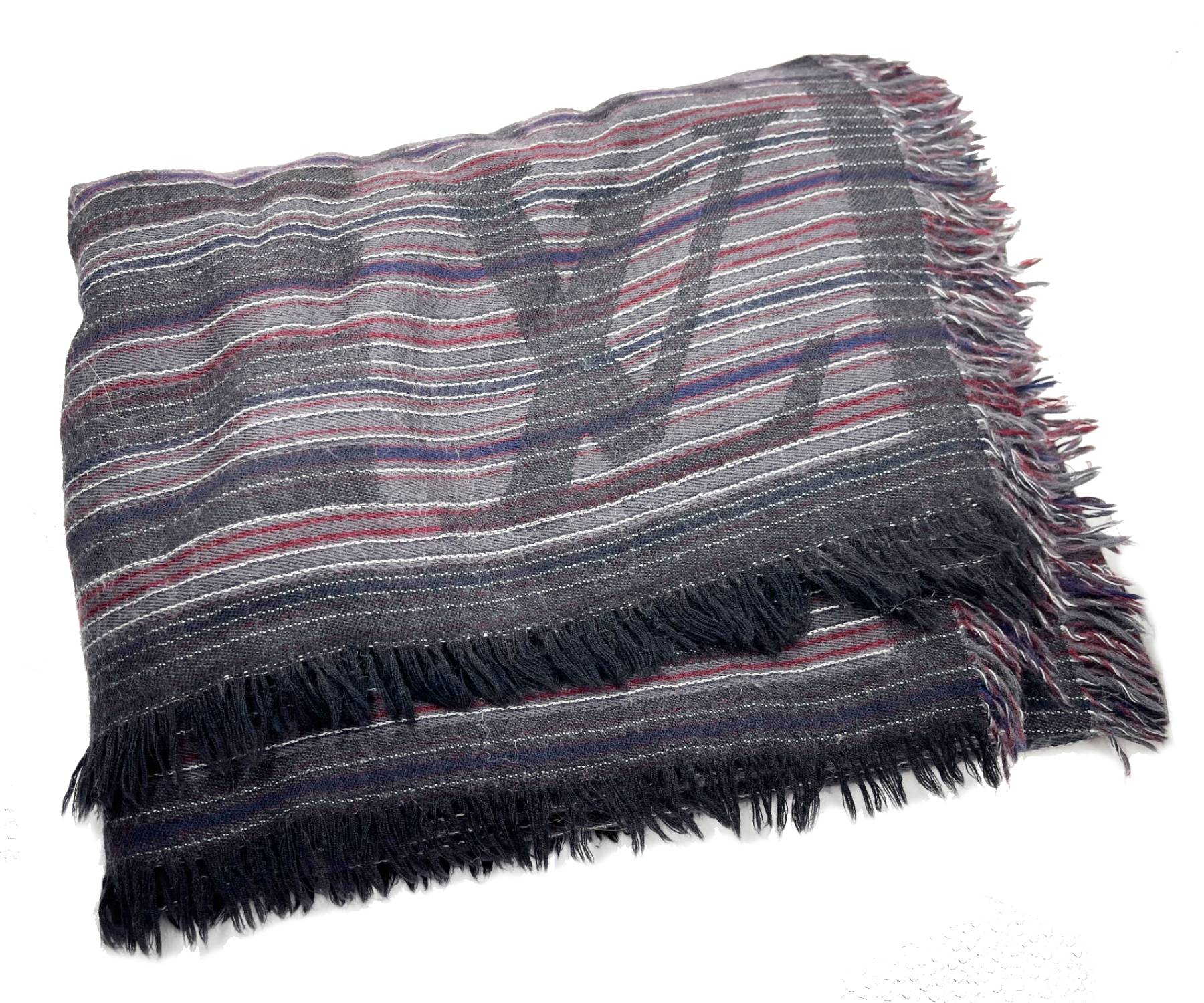 Louis Vuitton Dark Grey Stripe Cashmere Wool Shawl Scarf.