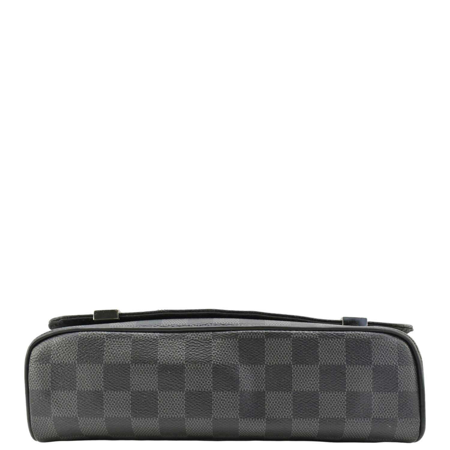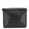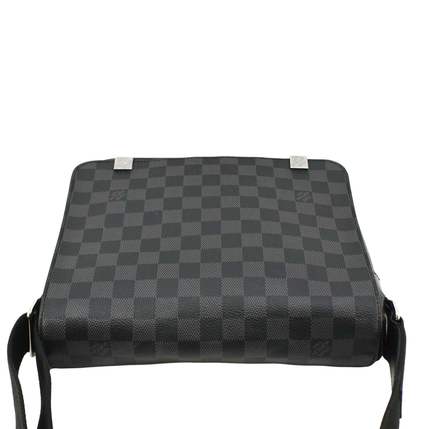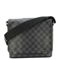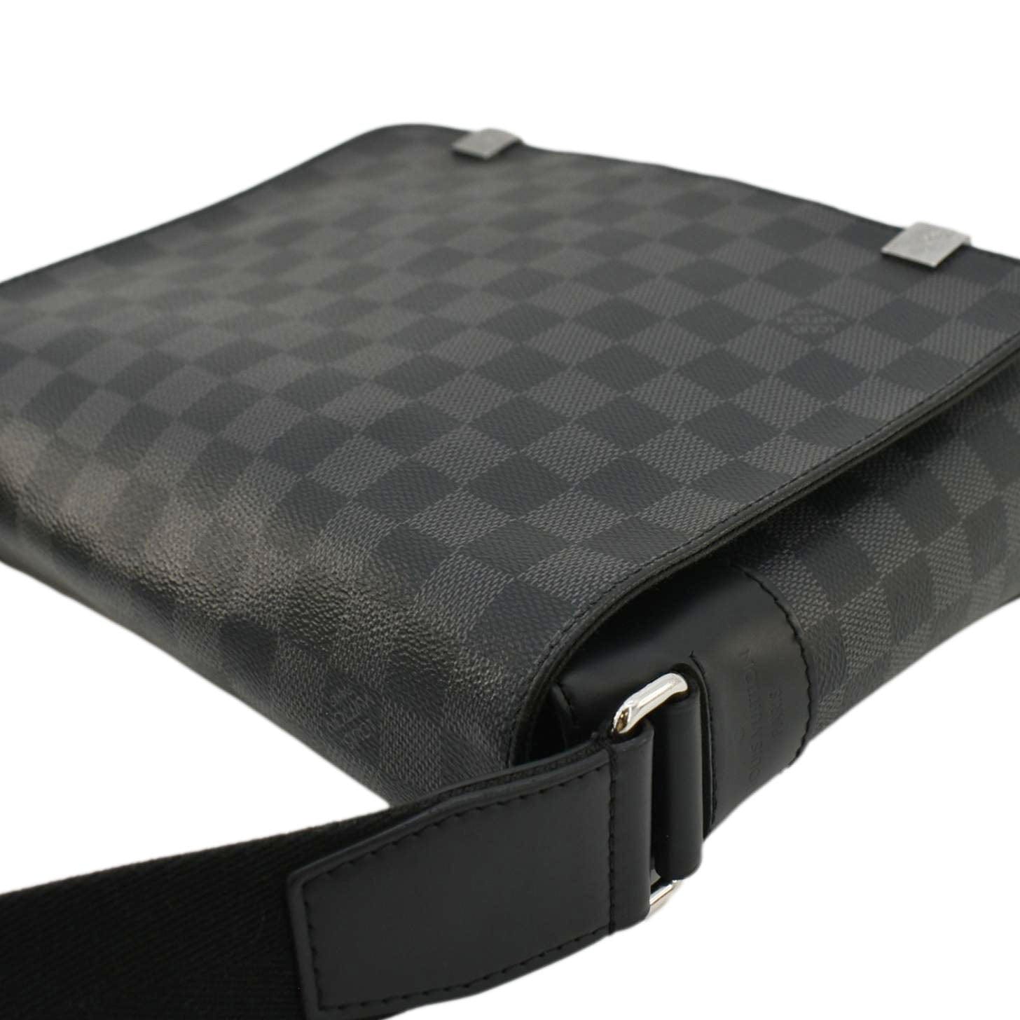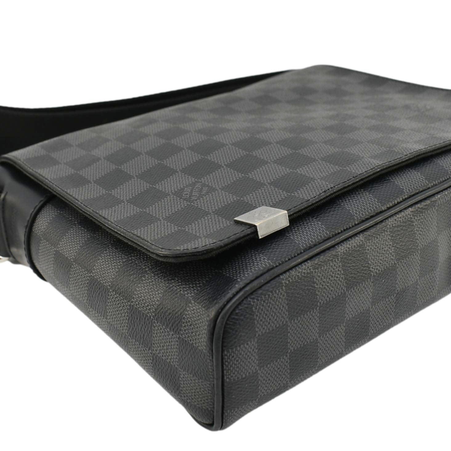 The Louis Vuitton District PM Messenger Bag in Damier Graphite features a sleek black checkered canvas with smooth leather trim. Compact and functional, it has a magnetic flap closure and an adjustable strap for comfortable crossbody wear.