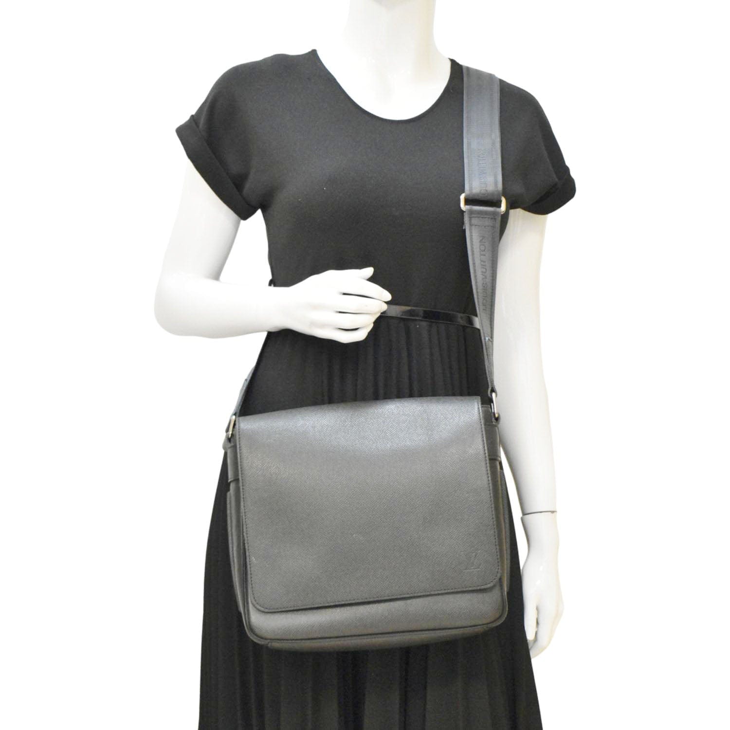 The Louis Vuitton District PM Taiga Leather Crossbody Bag in black features a sophisticated yet casual design crafted from durable Taiga leather. Its adjustable strap and sleek silhouette make it an ideal choice for both everyday wear and stylish outings.
