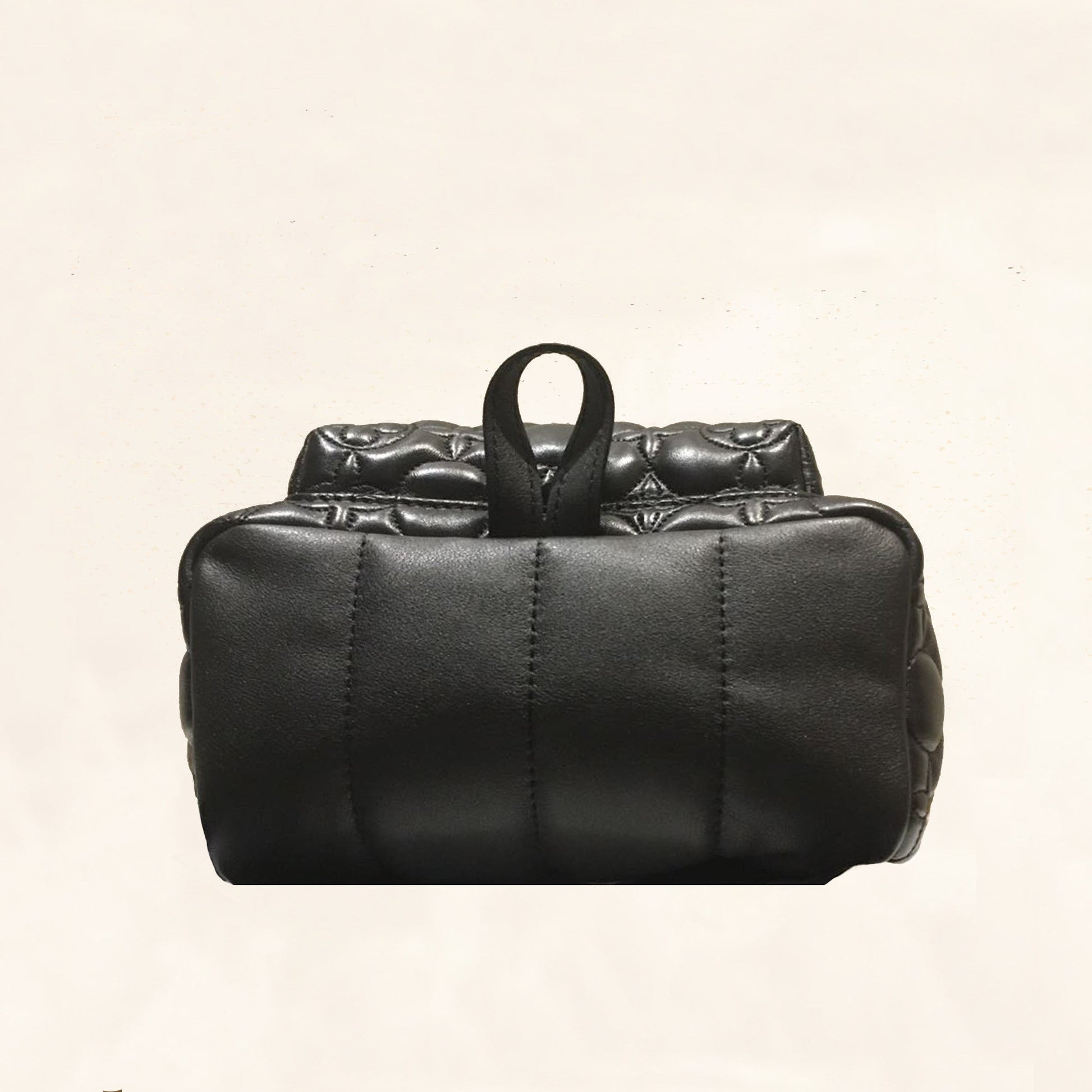 Characteristics: This piece features a body of luxurious embroidered lambskin canvas with a black calfskin trim and a front zipped pocket. The backpack is reinforced with strong cowhide leather including a top handle, and adjustable leather shoulder straps. The gold metallic zipper opens to a nylon fabric with a patch pocket and a D ring.