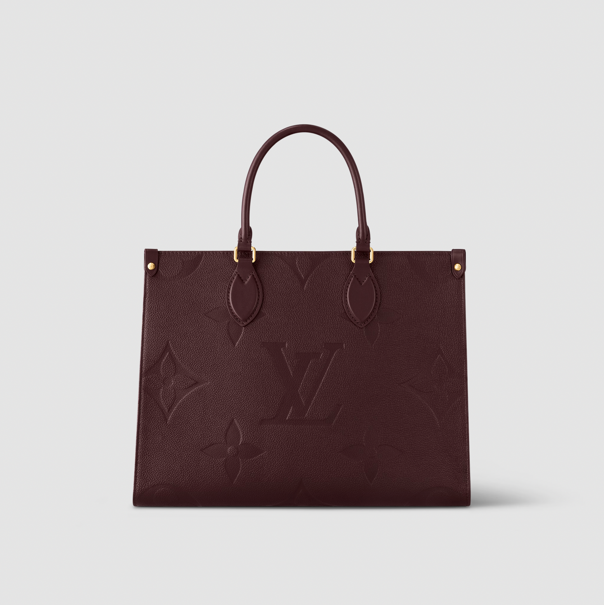 Characteristics: The OnTheGo MM tote is made from grained Monogram Empreinte cowhide leather, a soft leather that is embossed with a large Monogram pattern. Large enough for daily essentials such as a laptop, it features two sets of handles, short and long, for carry options. The inside zipped pocket and two inside flat pockets help keep things organized.