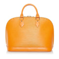 The Alma PM is crafted of bright orange Epi Leather and features rolled leather handles, a top zip closure, and an interior slip pocket.