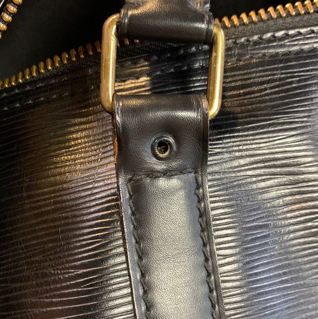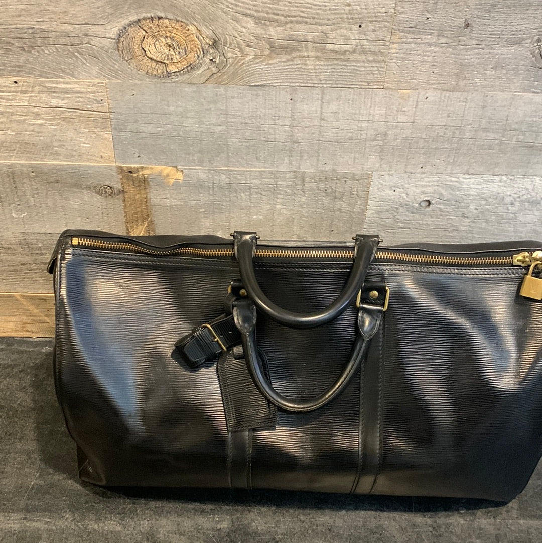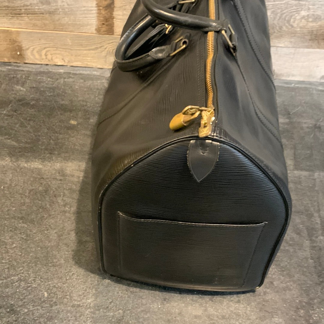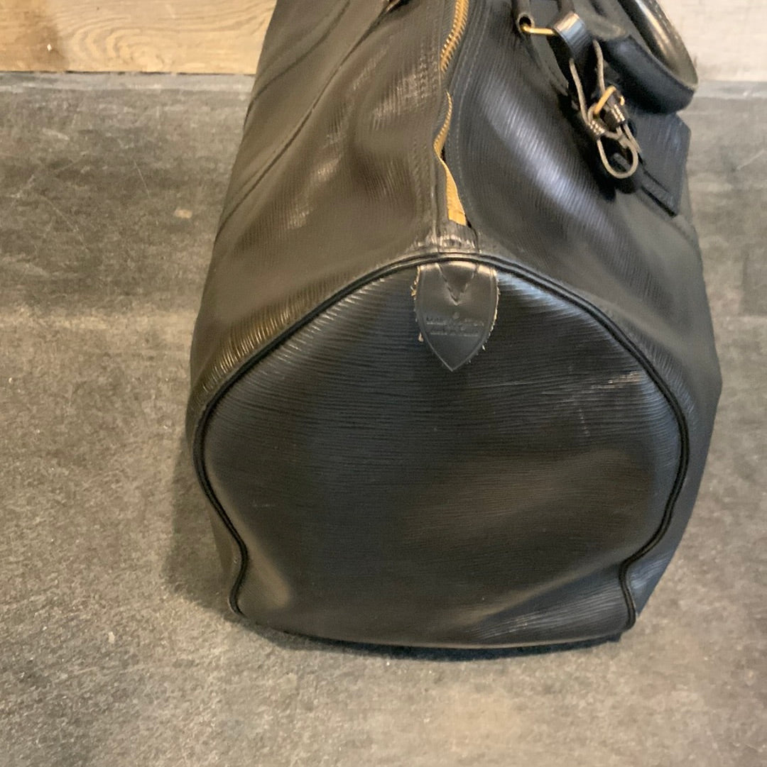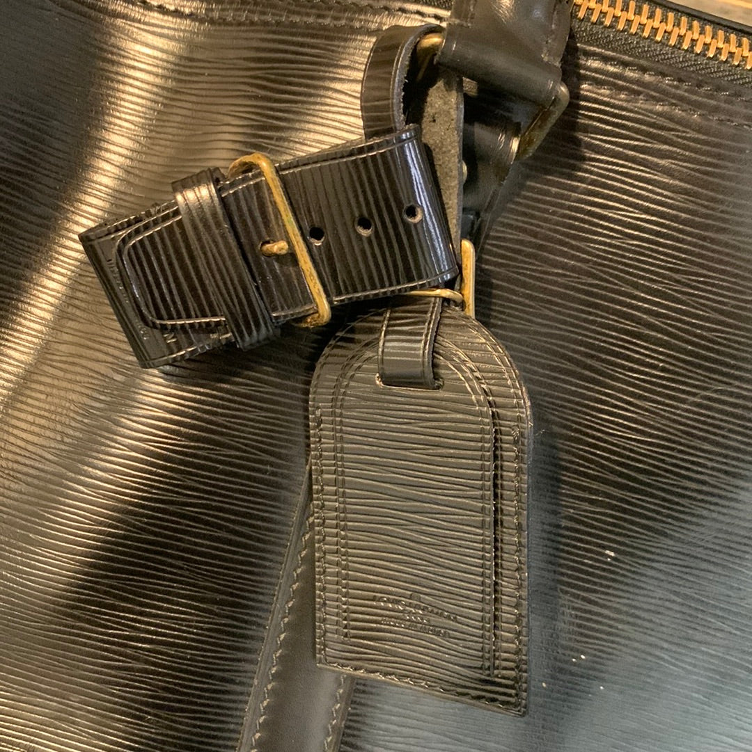 This is a Vintage Louis Vuitton Epi Keepall 50 from 1989. It is good shape with some wear. One rivet is missing. Comes w luggage tag, lock and certificate of ity.
