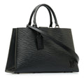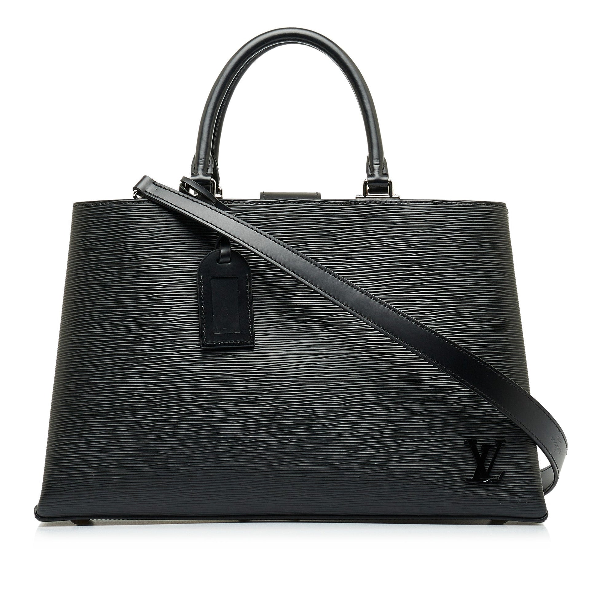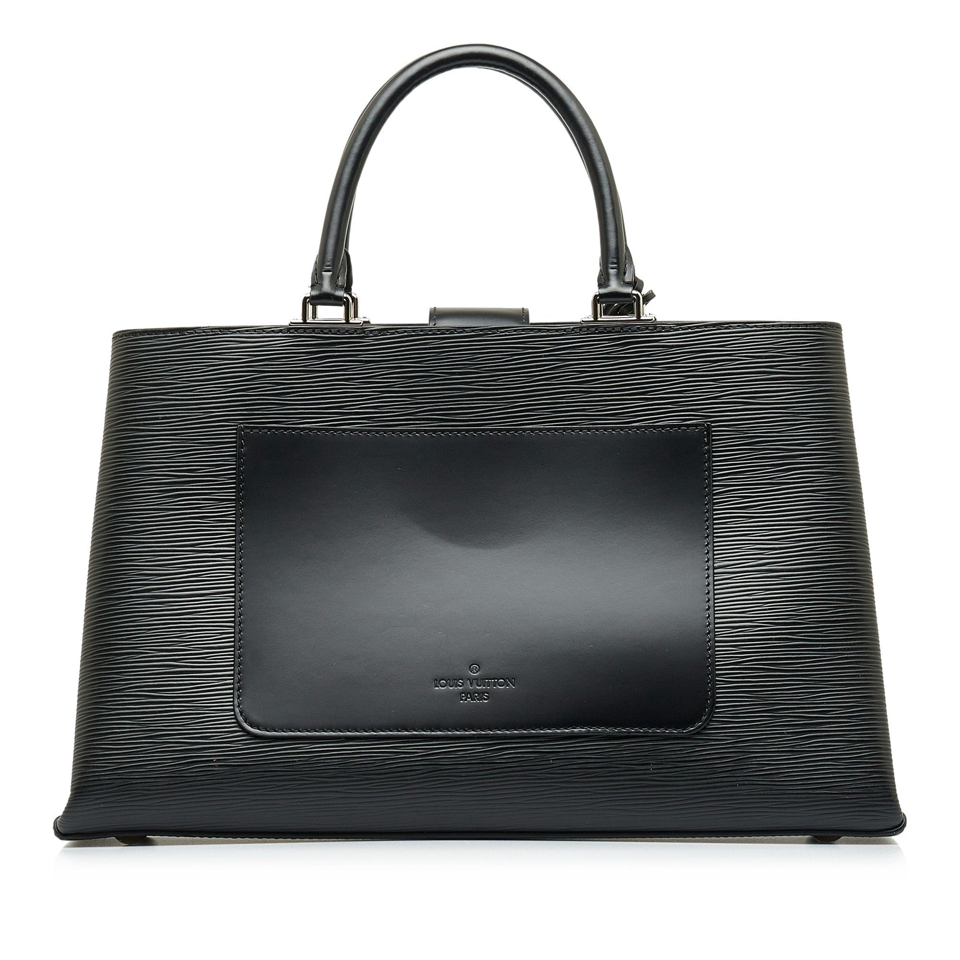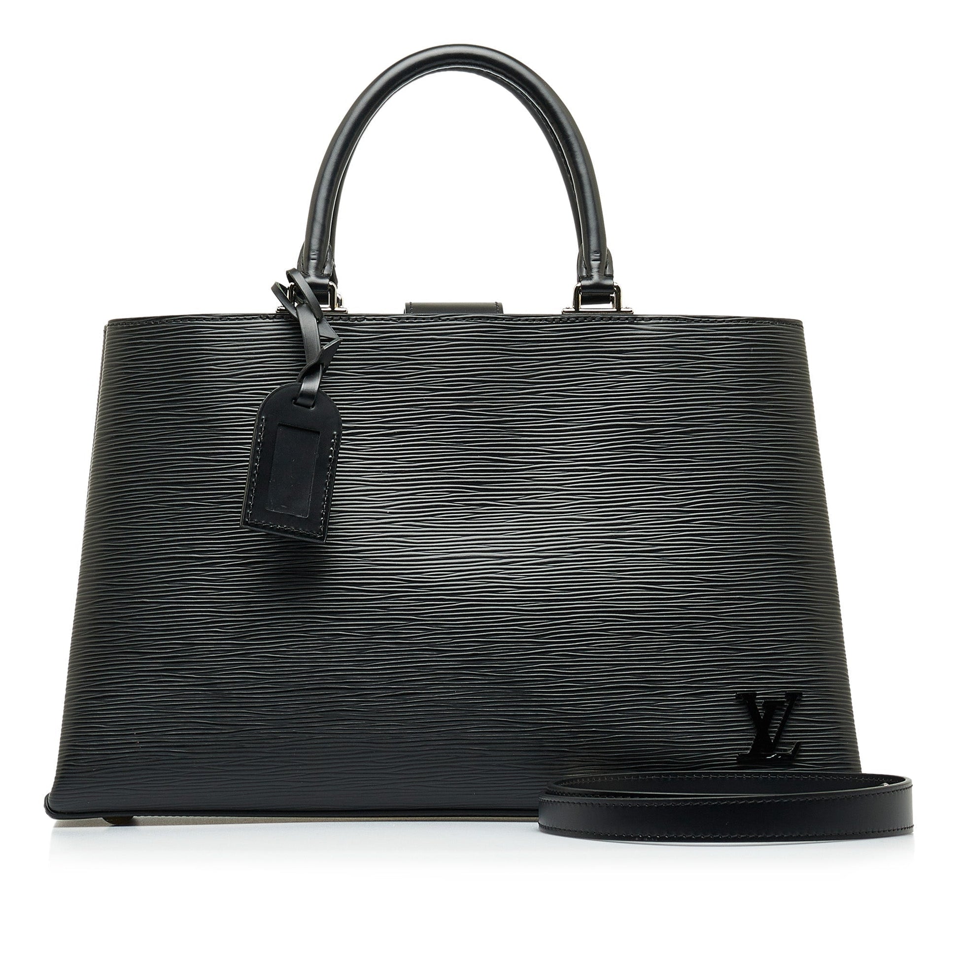The Kleber MM features an epi leather body, rolled handles, a detachable flat strap, an open top with a flat strap, an exterior slip pocket, and interior zip and slip pockets.