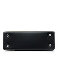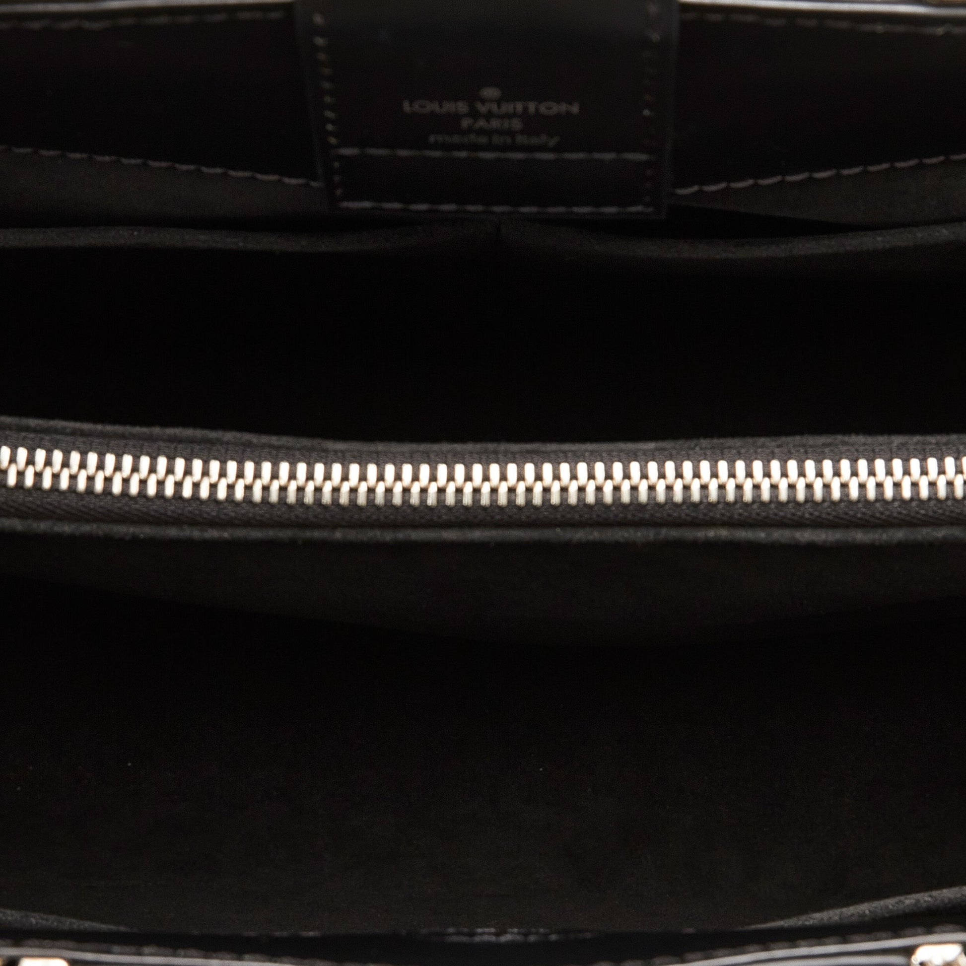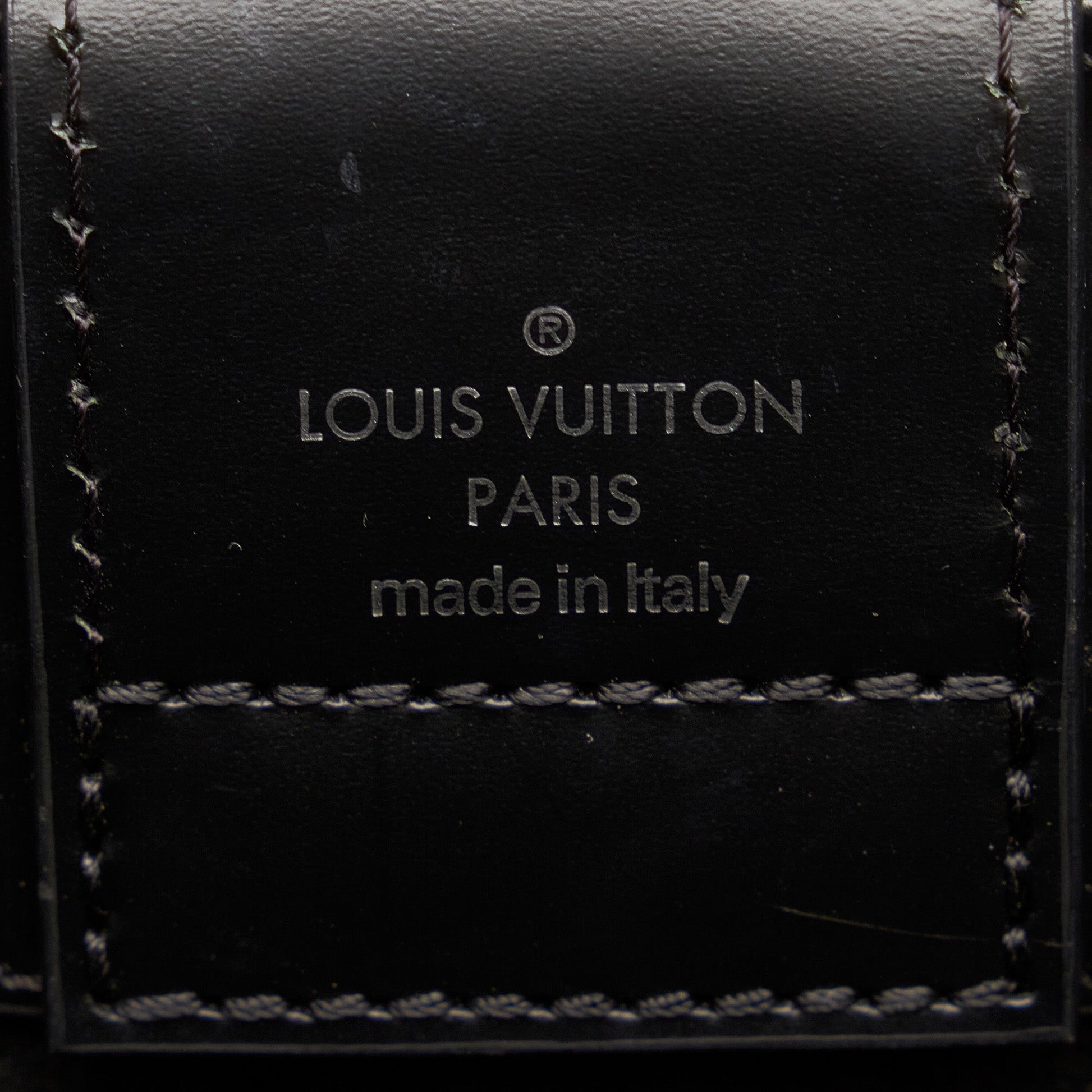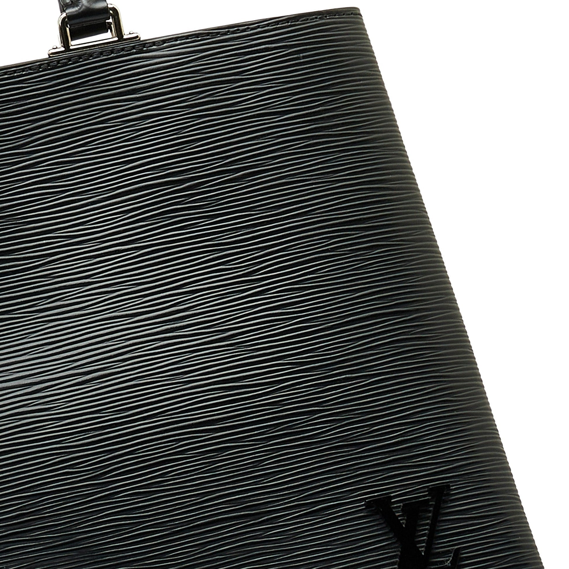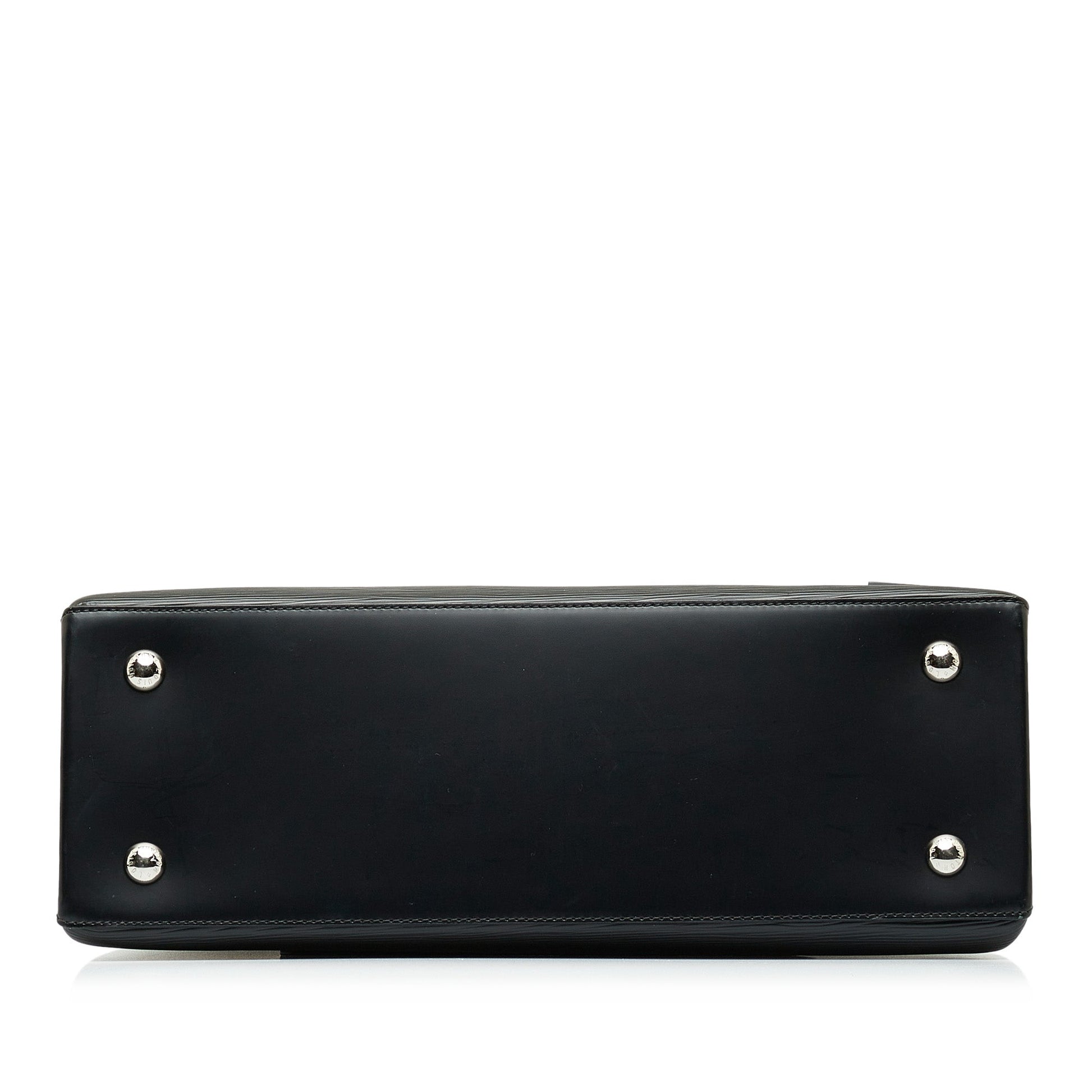The Kleber MM features an epi leather body, rolled handles, a detachable flat strap, an open top with a flat strap, an exterior slip pocket, and interior zip and slip pockets.