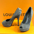 Prenez de la hauteur avec ces escarpins en daim gris de la maison Louis Vuitton avec cadenas Gold à l’arrière.