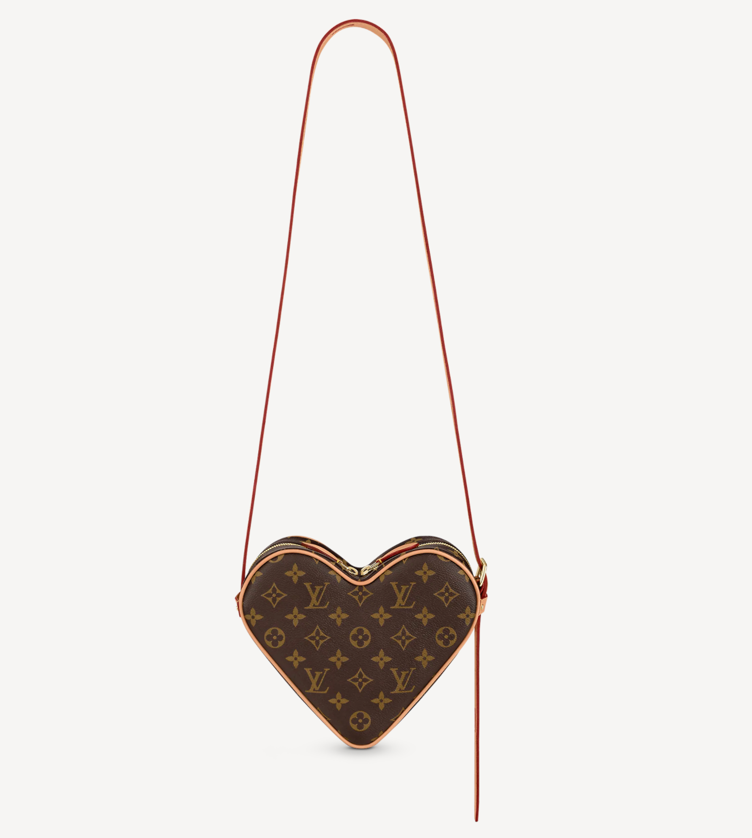 Characteristics: The Coeur is a small handbag in the shape of a heart fashioned from Monogram canvas. For Cruise 2021, Nicolas Ghesquière twists the Monogram pattern by printing a small bright red heart on the top left, echoing the bag’s own form. The adjustable leather strap enables comfortable shoulder and cross-body carry.