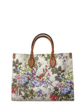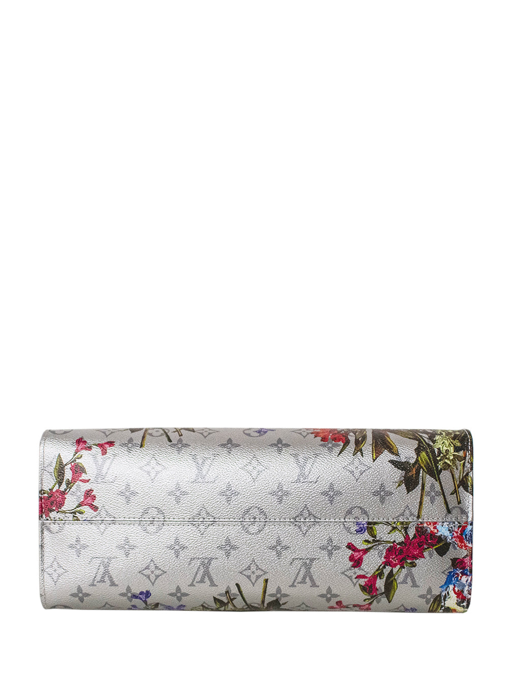 Featuring a feminine floral design and metallic-silver coated canvas, the OnTheGo MM tote by Nicolas Ghesquiere adds a touch of elegance to any outfit.