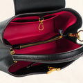 Characteristics: This piece is made of beautiful full grain taurillon leather in black, with a fuchsia interior calfskin lining. It features semi-rigid leather handles secured by gold ring handle links and a small cross-over flap that has a monogram fleur in gold. The flap opens to a portioned leather interior, with (2) large interior compartments with (1) flat pocket and (1) zipped pocket. It's unique flap can be two ways: outside to reveal the fleur or inside to show the iconic LV initials. Shoulder, elbow or hand carry options.