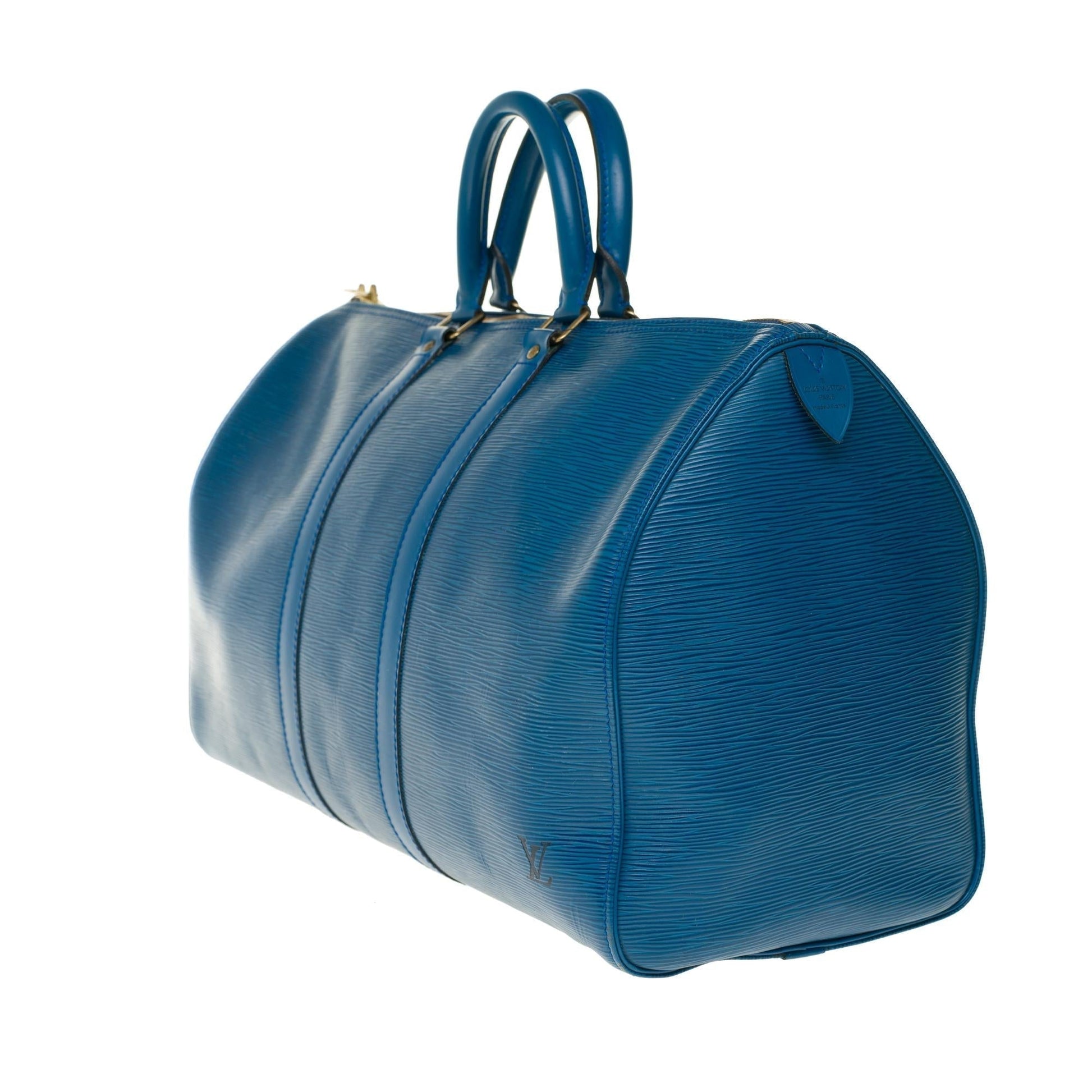 The spacious Louis Vuitton bag "Keepall" 45cm in blue epi leather, zipper with double sliders, double handle in blue leather.