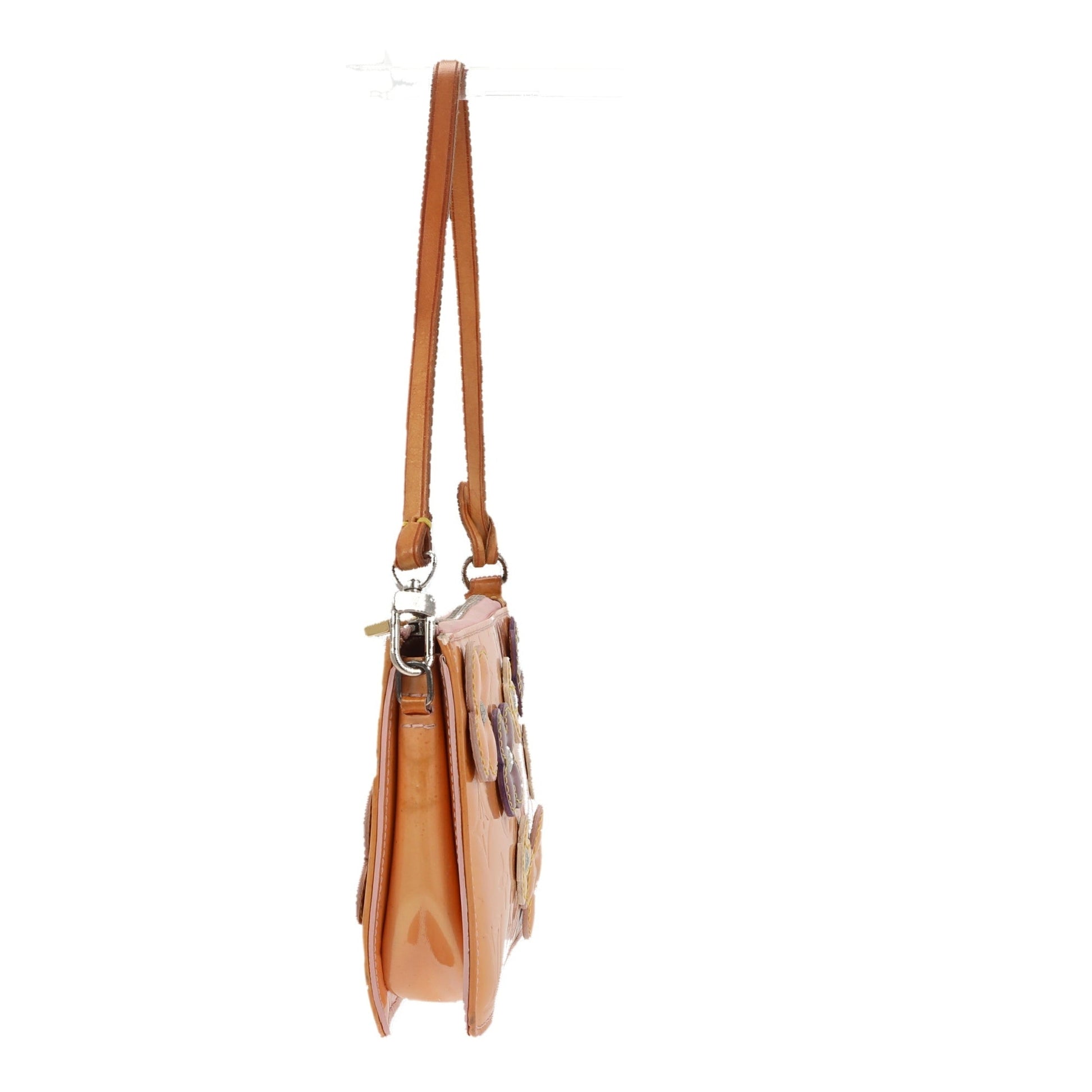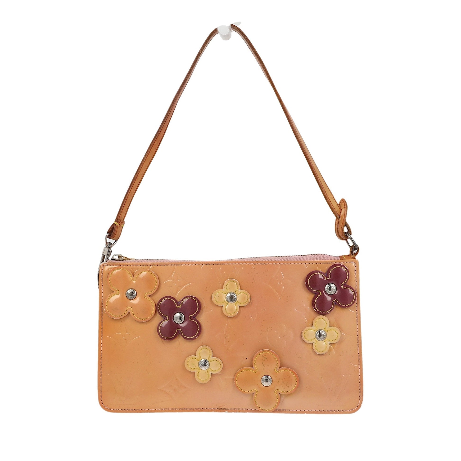 This beautiful pochette is crafted of patent in Yellow, with patent flowers applications