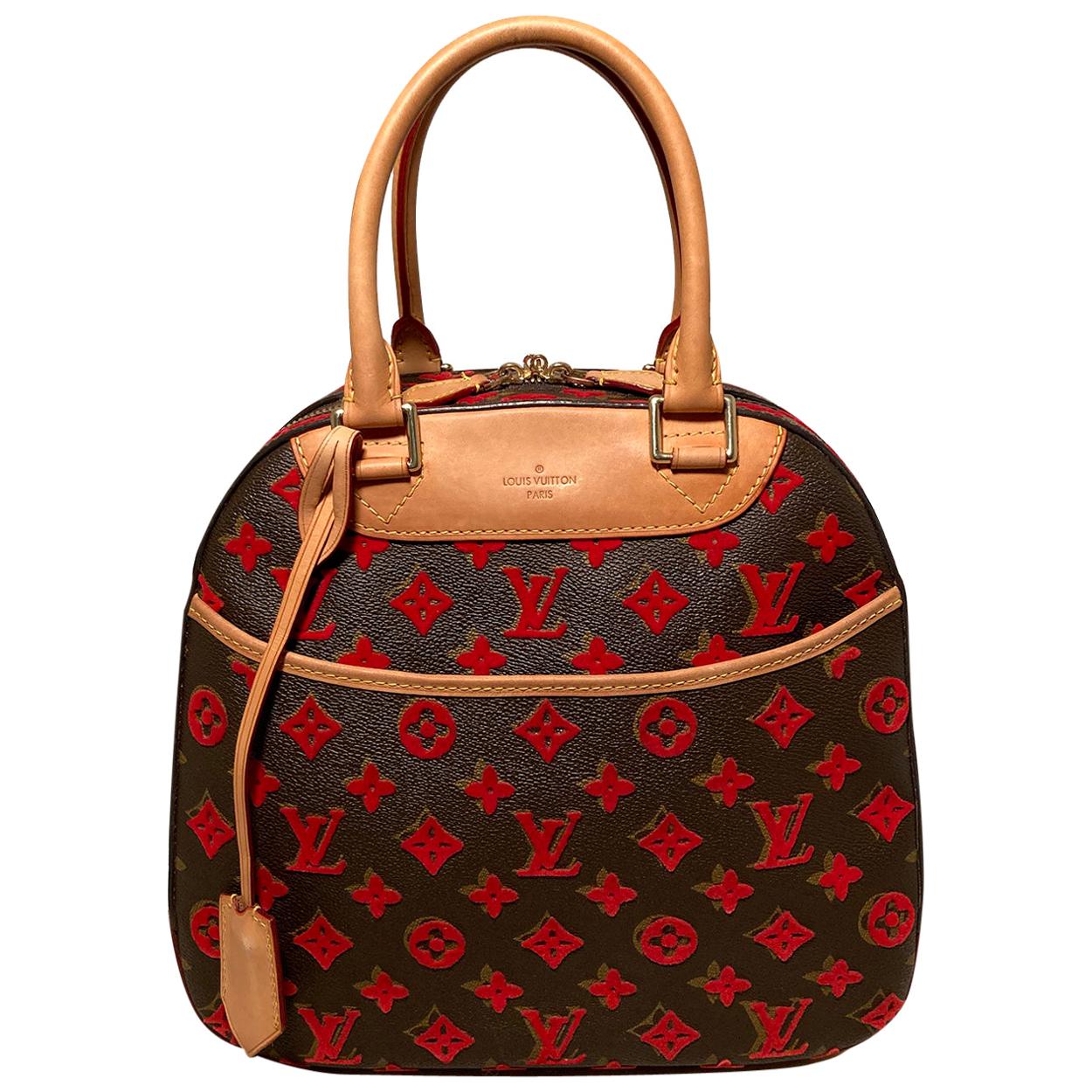 Signature Deauville bag reimagined in brown canvas and 3D red velvet monogram with tan leather trim and brass hardware.