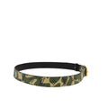 This fabulous belt is finely crafted of beige and green camouflage canvas with black leather and golden color buckle details.