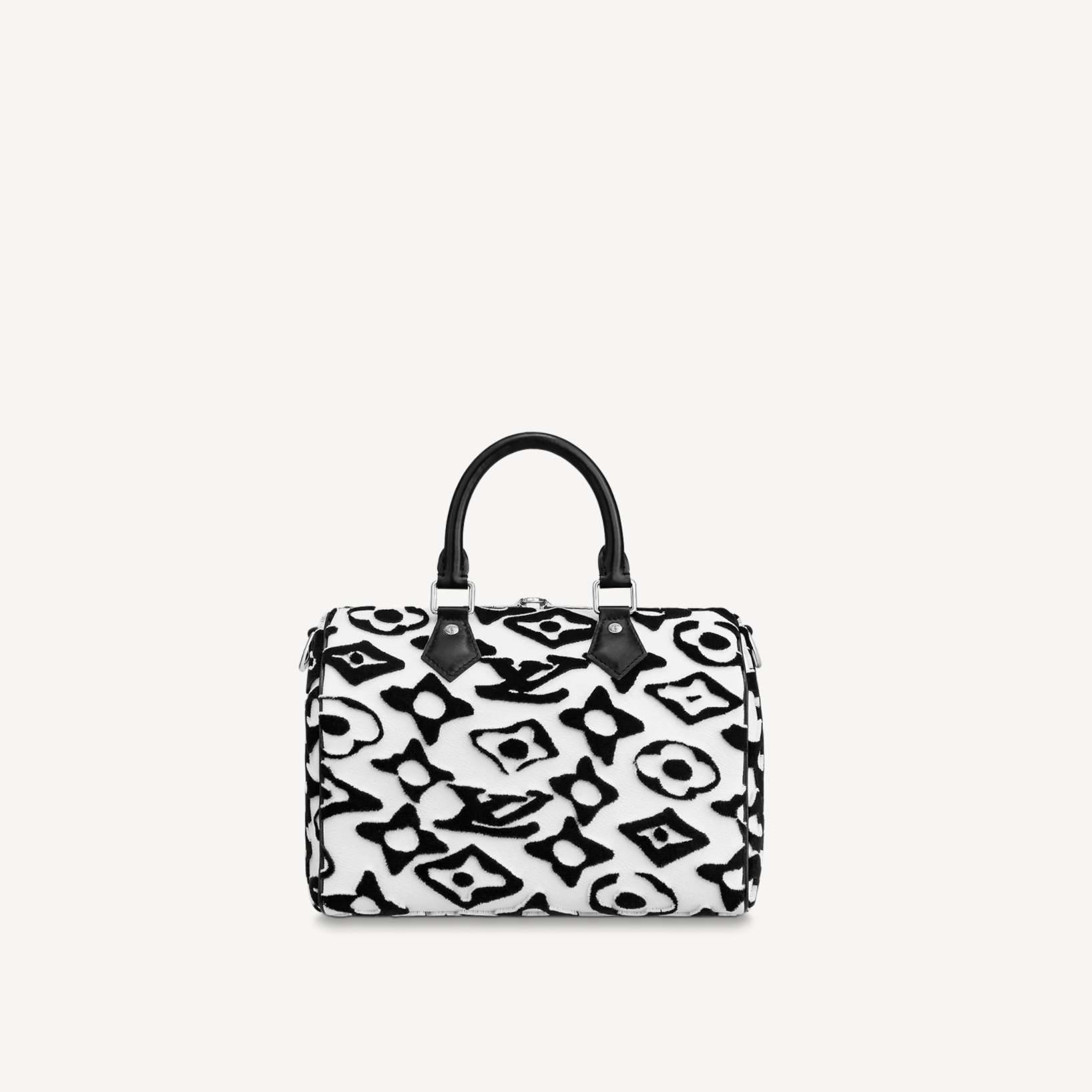 Characteristics: This special-edition Speedy 25 handbag comes from the exclusive LV x UF collaboration. Swiss artist Urs Fischer has reworked the Monogram motif, to create a bold, graphic iteration of the iconic signature. The pattern is applied using a precise tuffetage technique, to produce the bag’s velvety, textured surface. The result: a highly covetable version of a House classic.