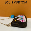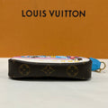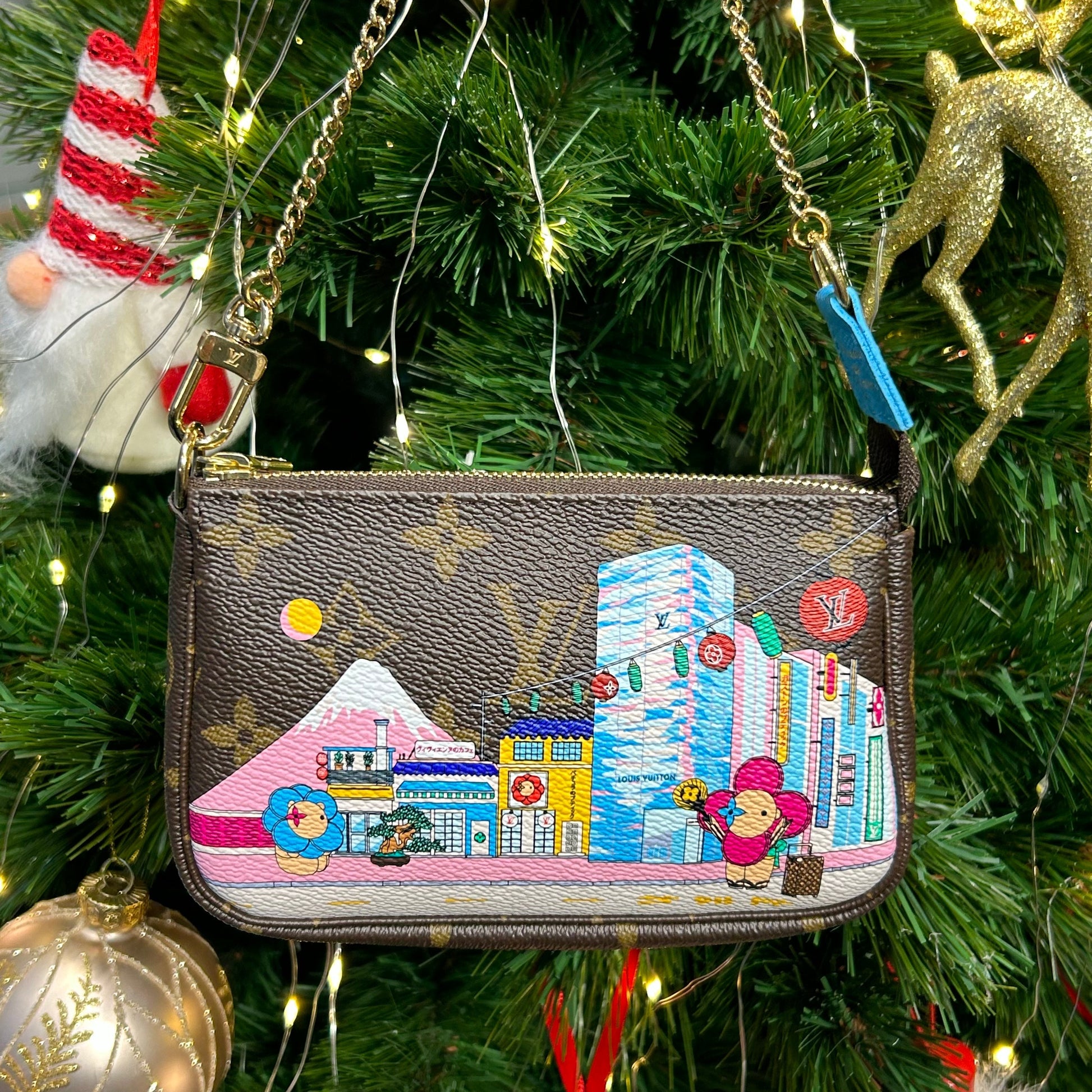 La mini pochette Louis Vuitton collection Vivienne Holiday est un accessoire élégant arborant un design emblématique. Ornée de l’illustration de Vivienne, la mascotte de la maison, devant le magasin de Tokyo et le mont Fuji, cette pochette compacte offre une touche ludique et chic.