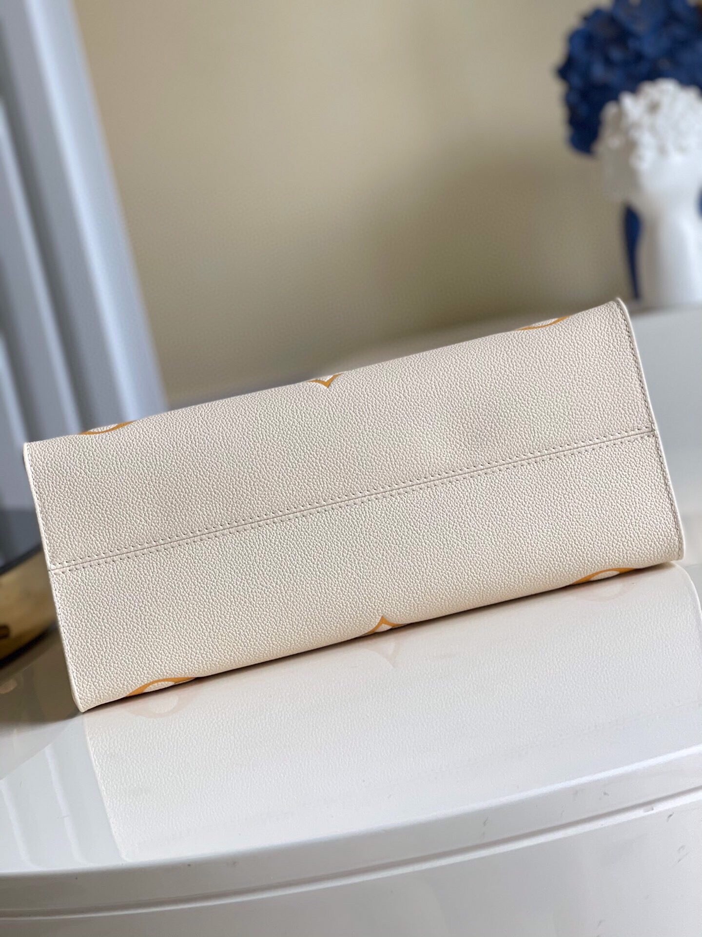 Made from a Monogram Empreinte leather with a subtle color gradient on the embossed Monogram pattern, the emblematic OnTheGo MM tote Bag is part of the By The Pool capsule collection. It has two sets of handles, long and short, for hand and shoulder carry, and a spacious interior, which easily fits essentials such as a laptop. A leather charm gives a playful spirit and highlights the LV craftsmanship.