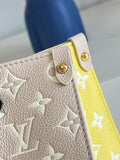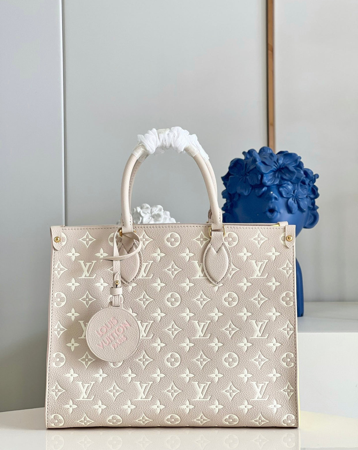 The OnTheGo tote Bag is made from Monogram Empreinte cowhide leather, featuring the Monogram pattern on different-colored leathers. The classic Monogram motif is first embossed, then printed on the leather. This is a roomy Bag and can easily fit a laptop. Its two sets of handles, short and long, give carry options.