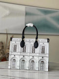 Part of the season’s LVxFornasetti capsule, this striking OnTheGo MM Architettura tote is crafted from printed matte calfskin, with Monogram canvas trim. The smooth leather mimics stone, upon which imaginary buildings are drawn in the signature Fornasetti manner. Fashion and function combine in this roomy carryall, ideal for office or city wear.