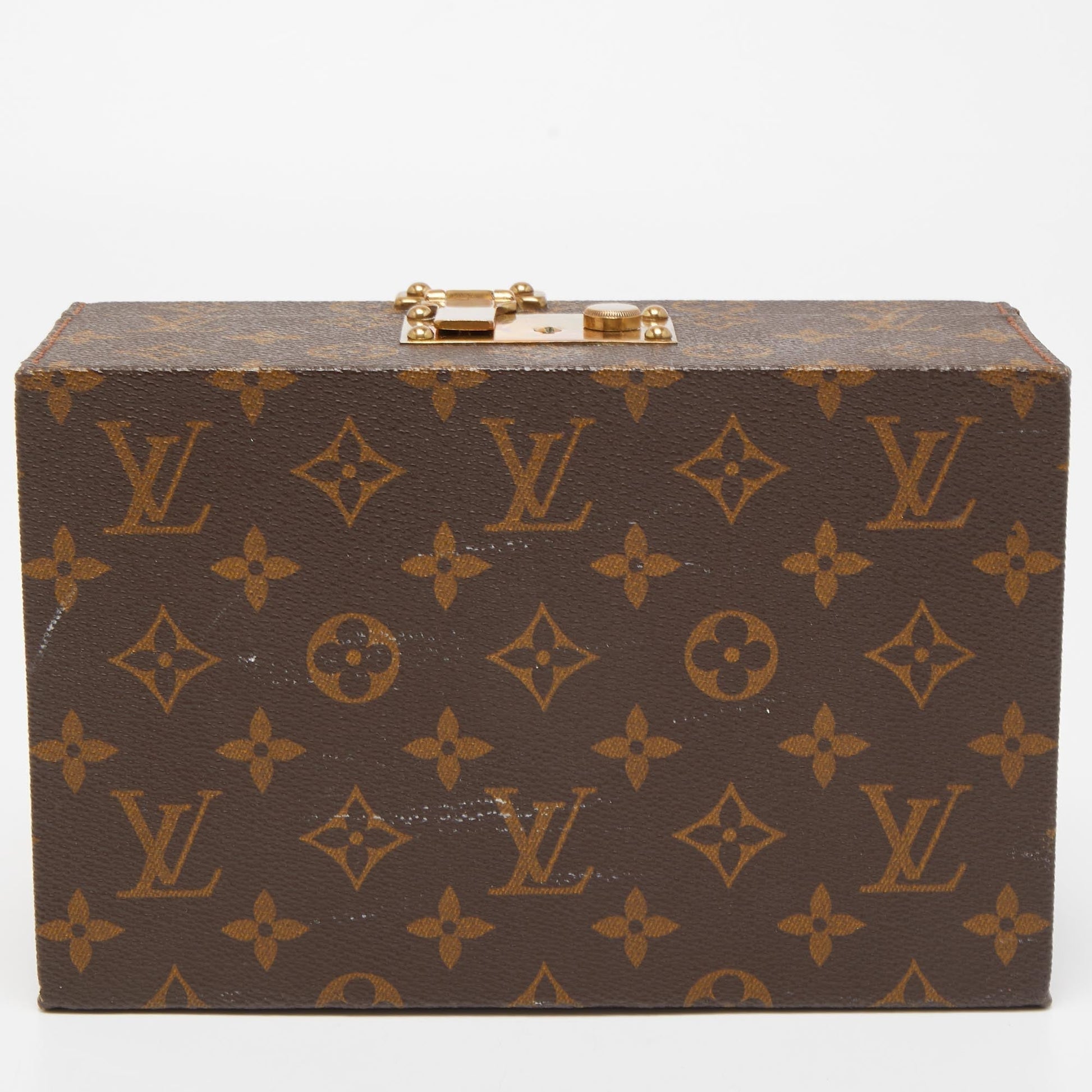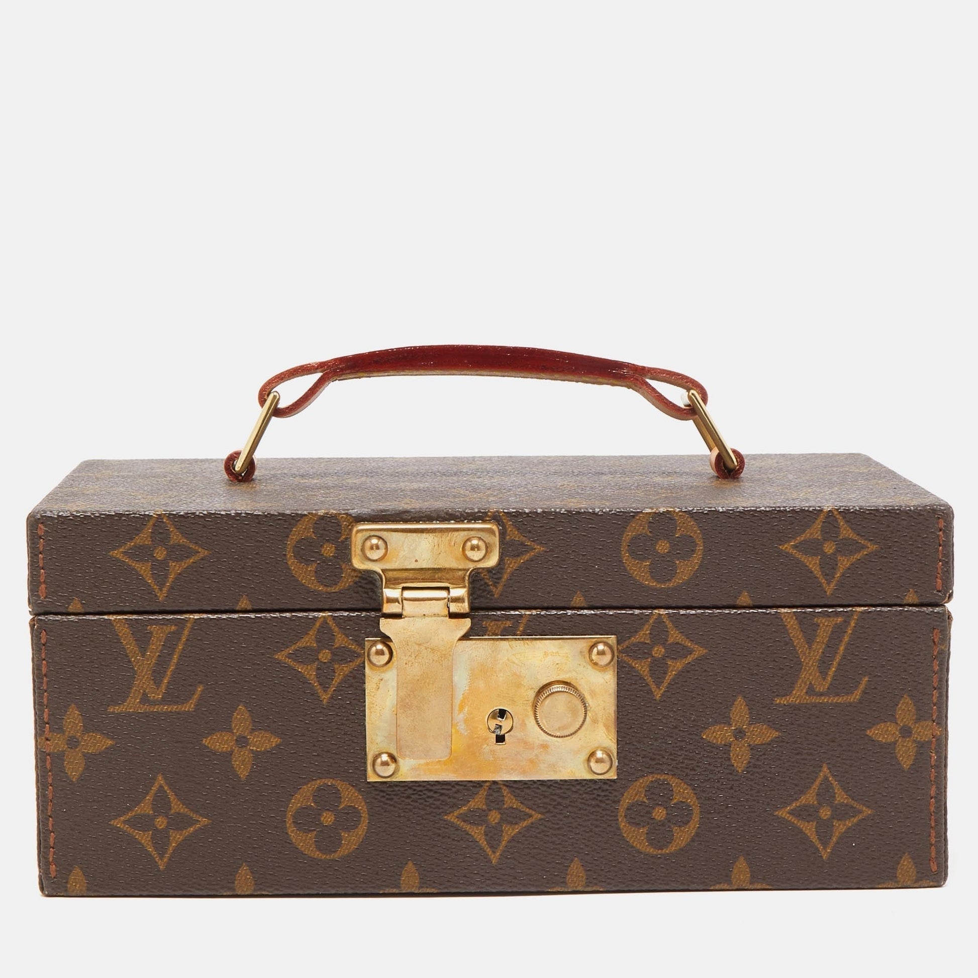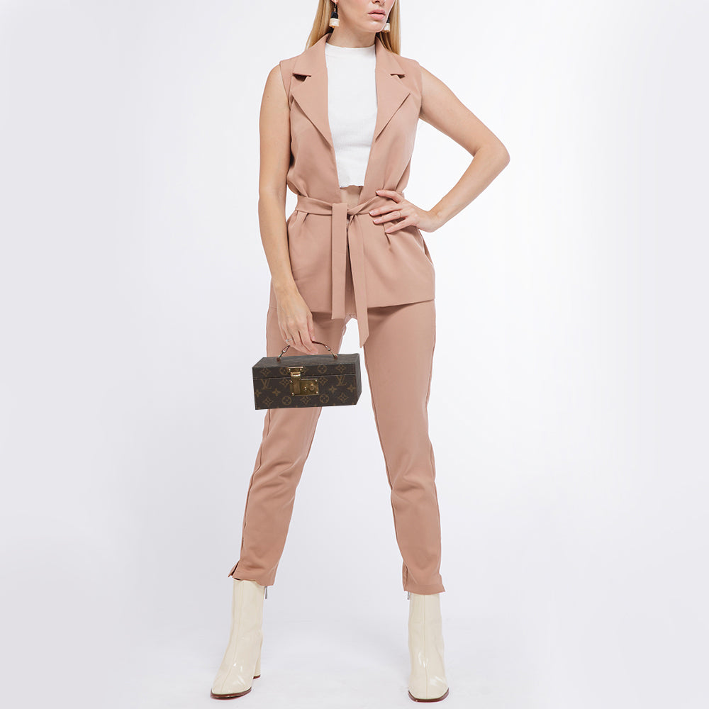A vintage inspired luxurious accessory this jewelry case by the House of Louis Vuitton is crafted to offer the finest. Made from Monogram canvas it features a sturdy silhouette with a sturdy top handle leather trims and gold tone metal hardware. Go ahead and make this fabulous piece yours today