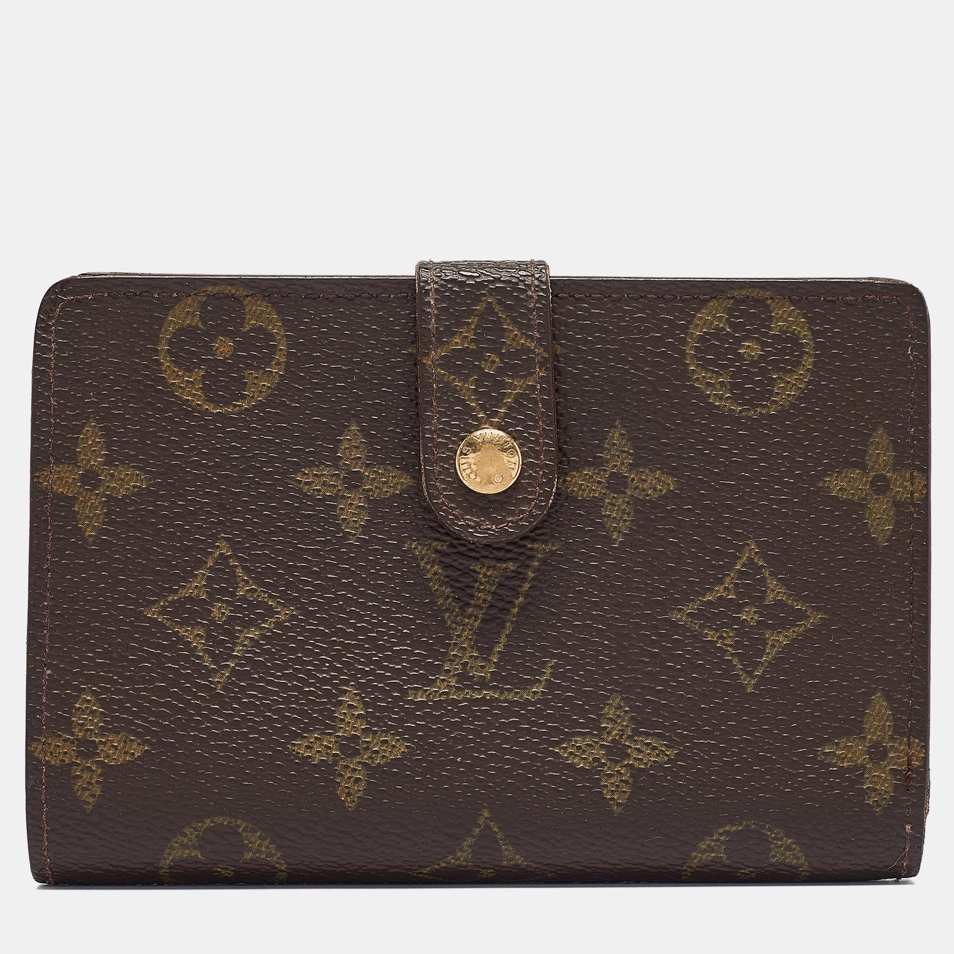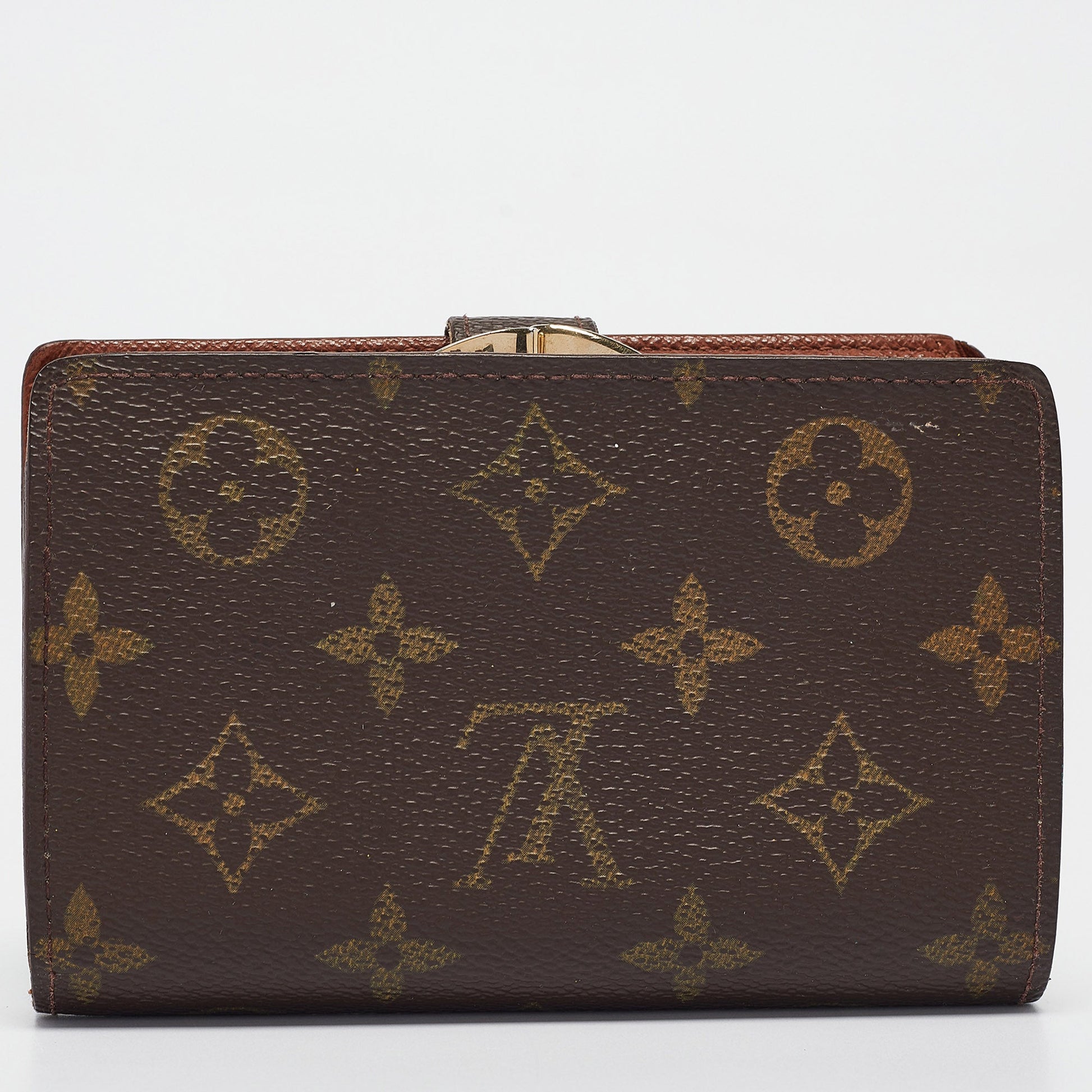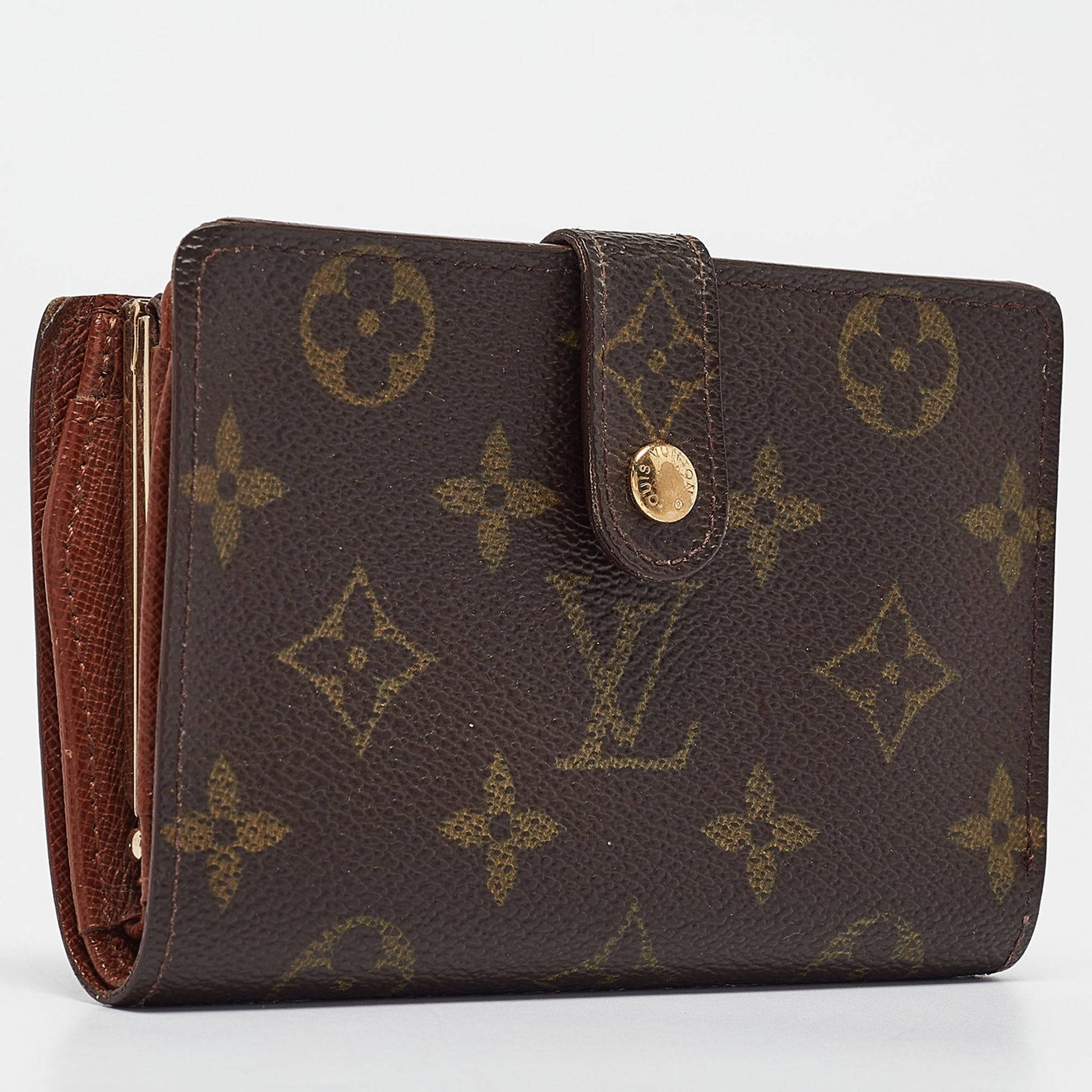 This fabulous French wallet from the house of Louis Vuitton is functional and stylish. It is made from Monogram canvas and lined with leather on the insides. The buttoned closure opens to multiple card slots, open compartments to arrange your cash and it also has a coin pocket that is secured by a kiss lock.