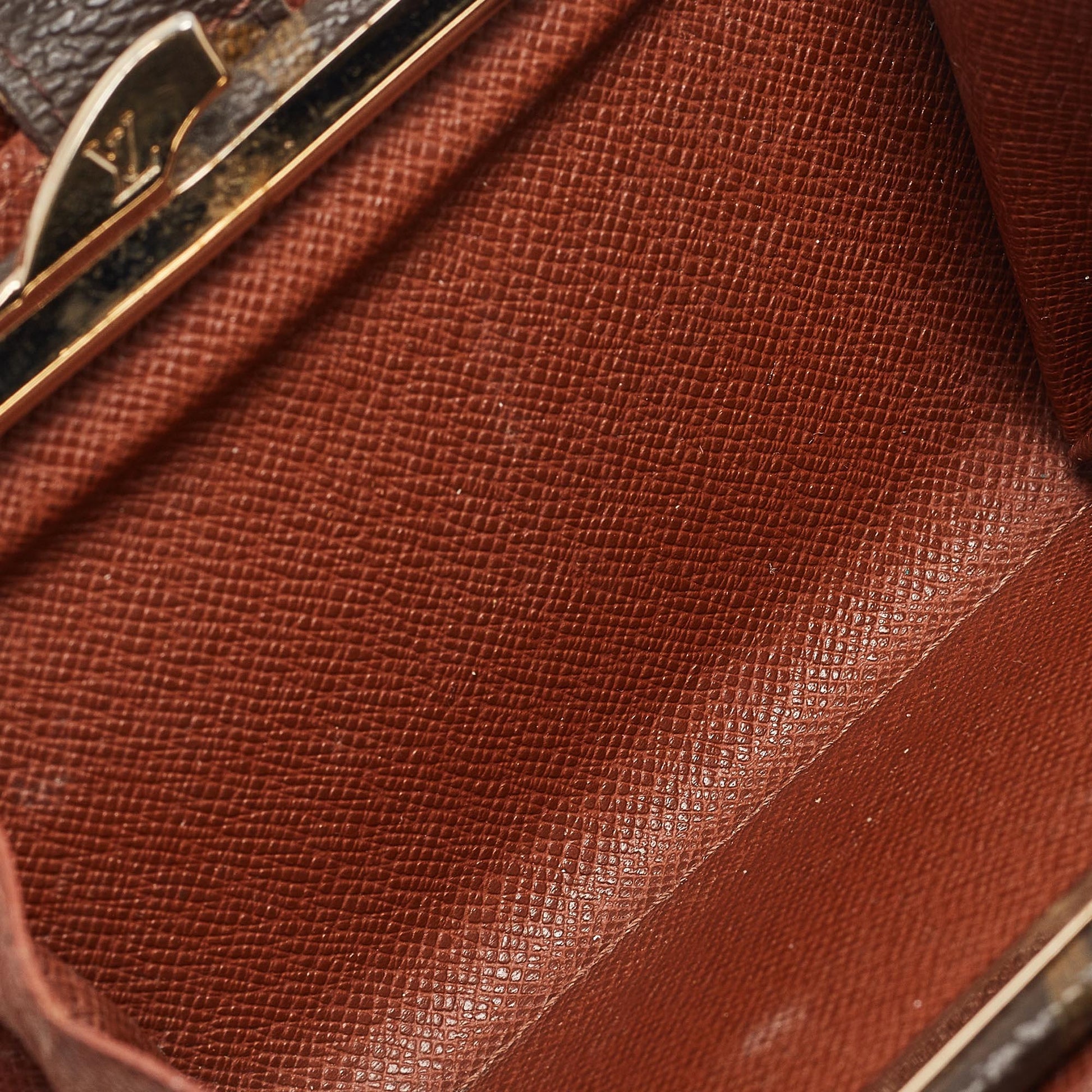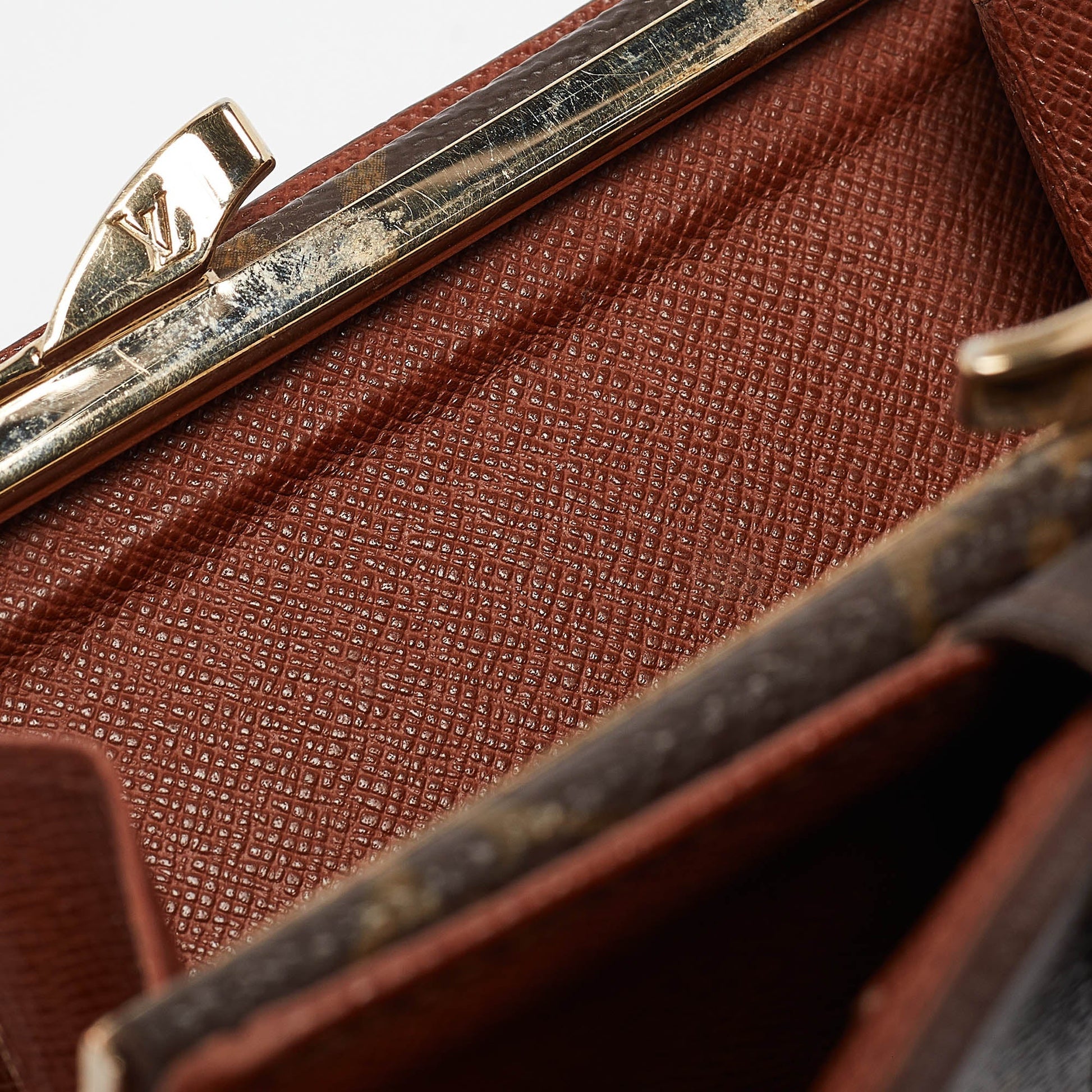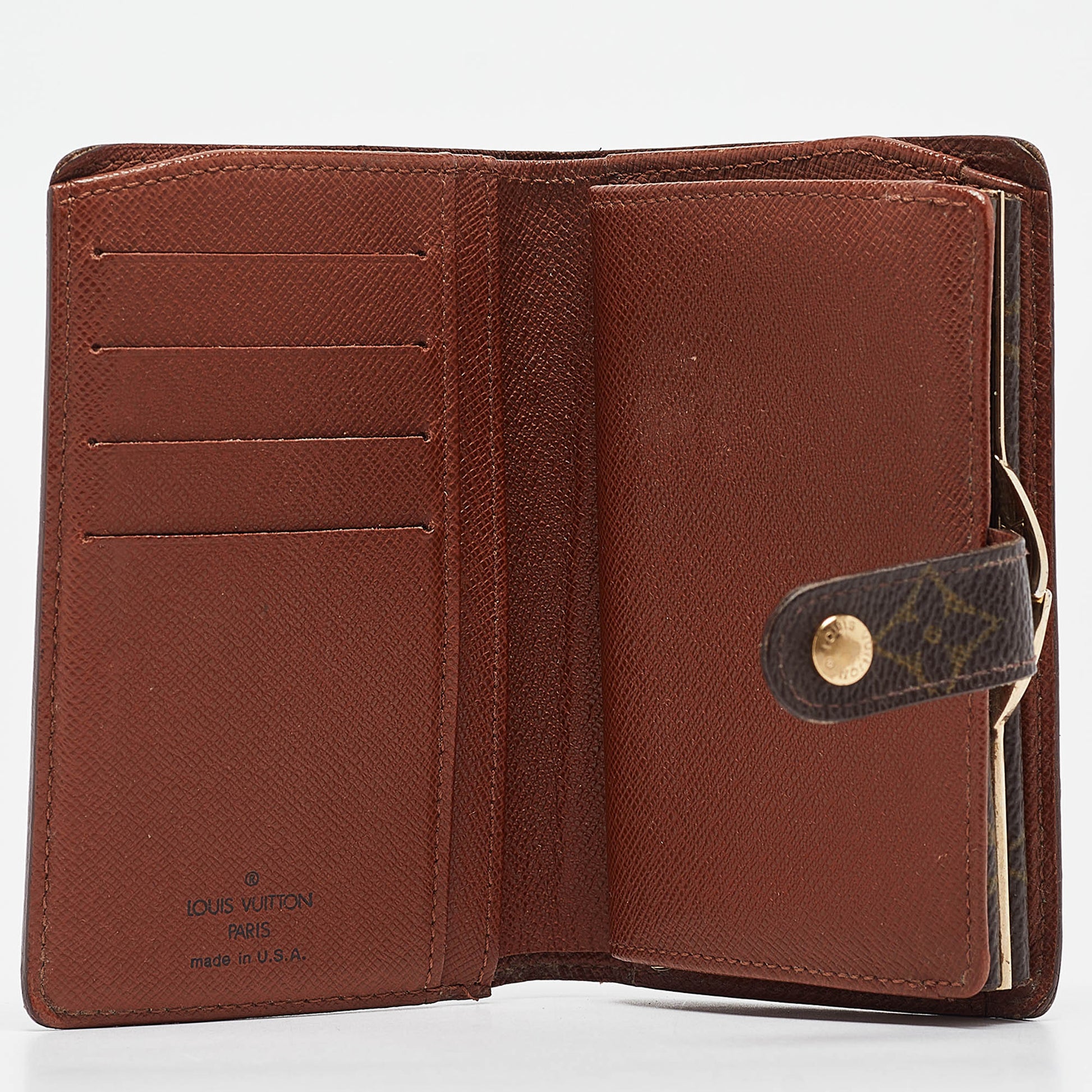 This fabulous French wallet from the house of Louis Vuitton is functional and stylish. It is made from Monogram canvas and lined with leather on the insides. The buttoned closure opens to multiple card slots, open compartments to arrange your cash and it also has a coin pocket that is secured by a kiss lock.