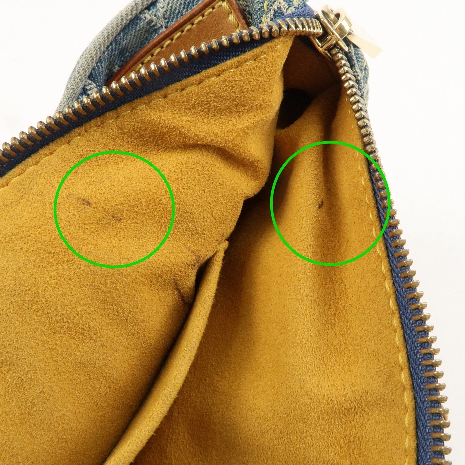(Stains) some stains, spots, discoloration on leather, black spots and fiber stains on handle, discoloration on opening and denim