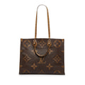The OnTheGo GM features a monogram canvas body, rolled leather top handles, flat leather shoulder straps, an open top with lobster claw clasp closure, and interior zip and slip pockets. Comes with dust bag