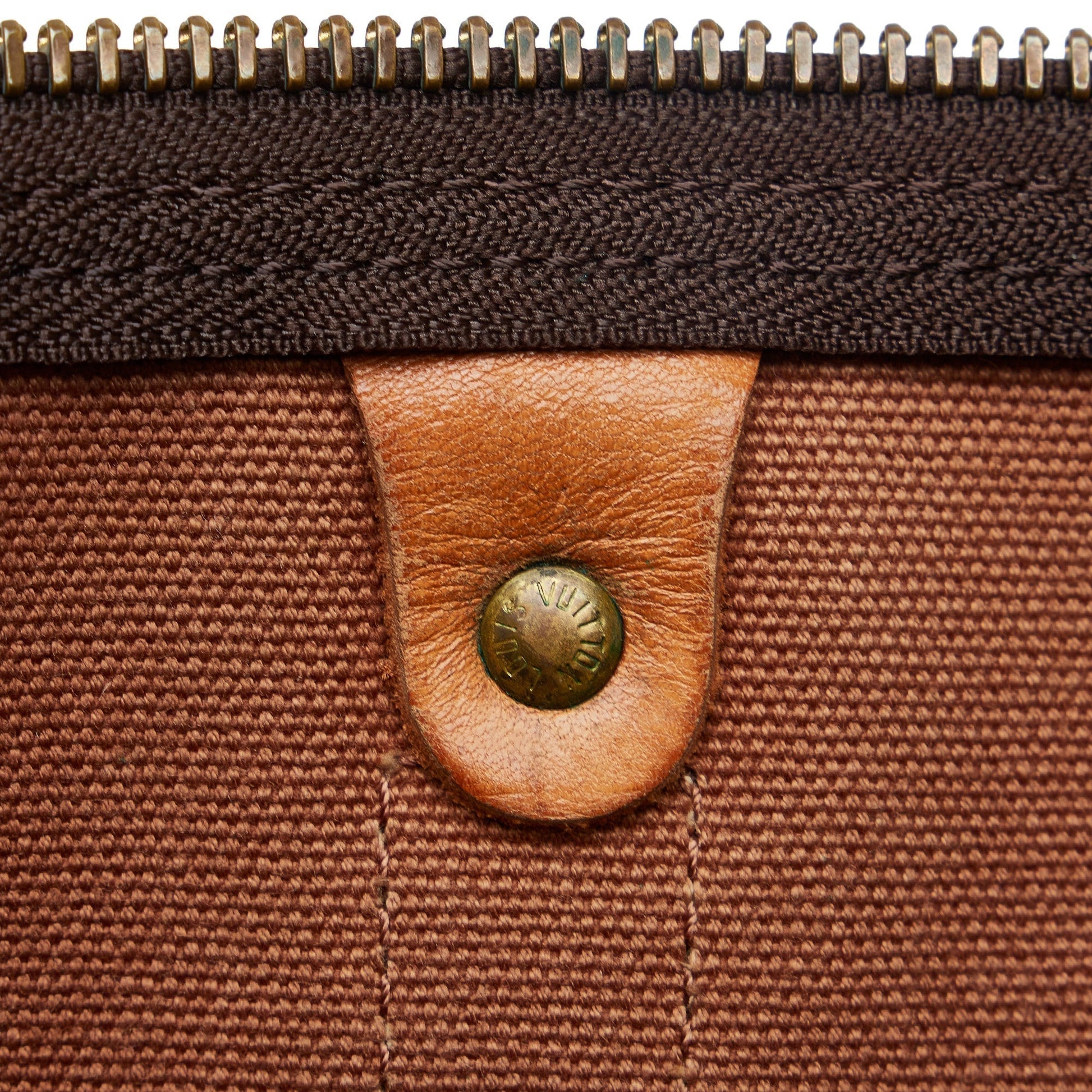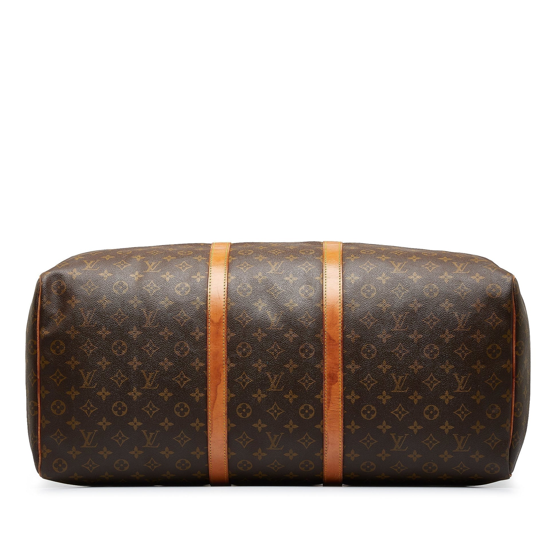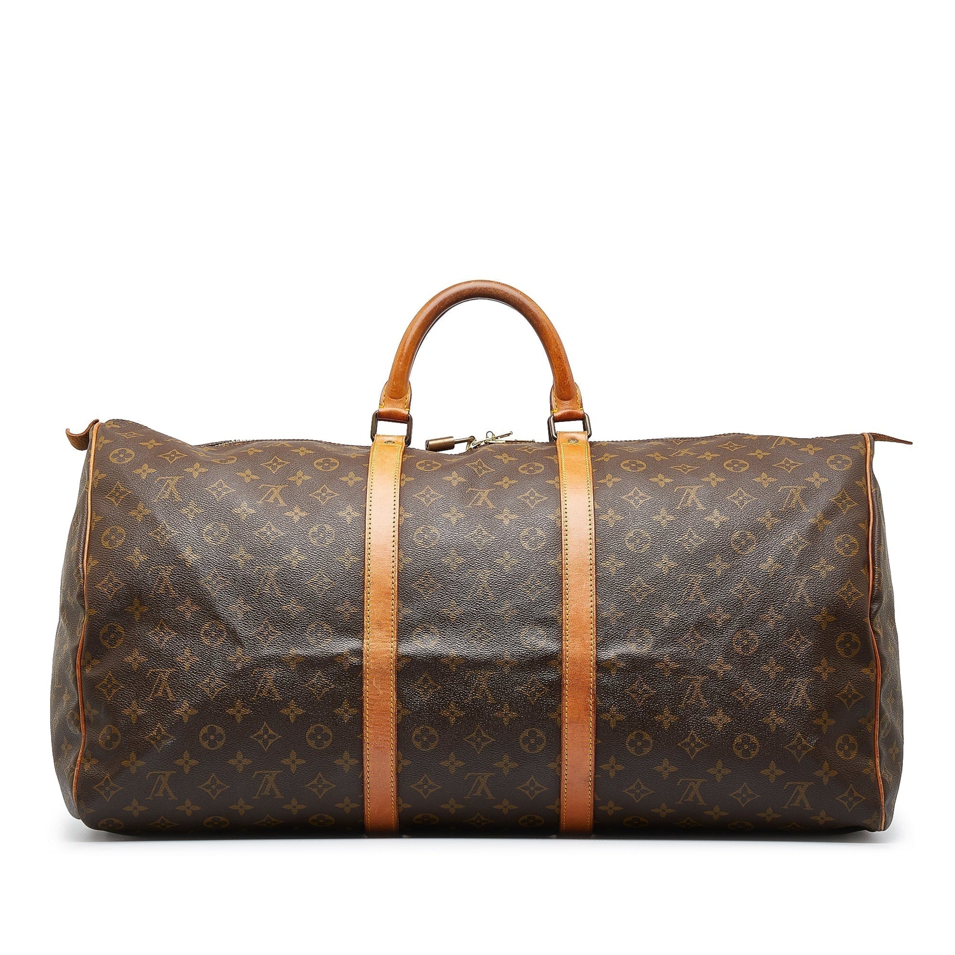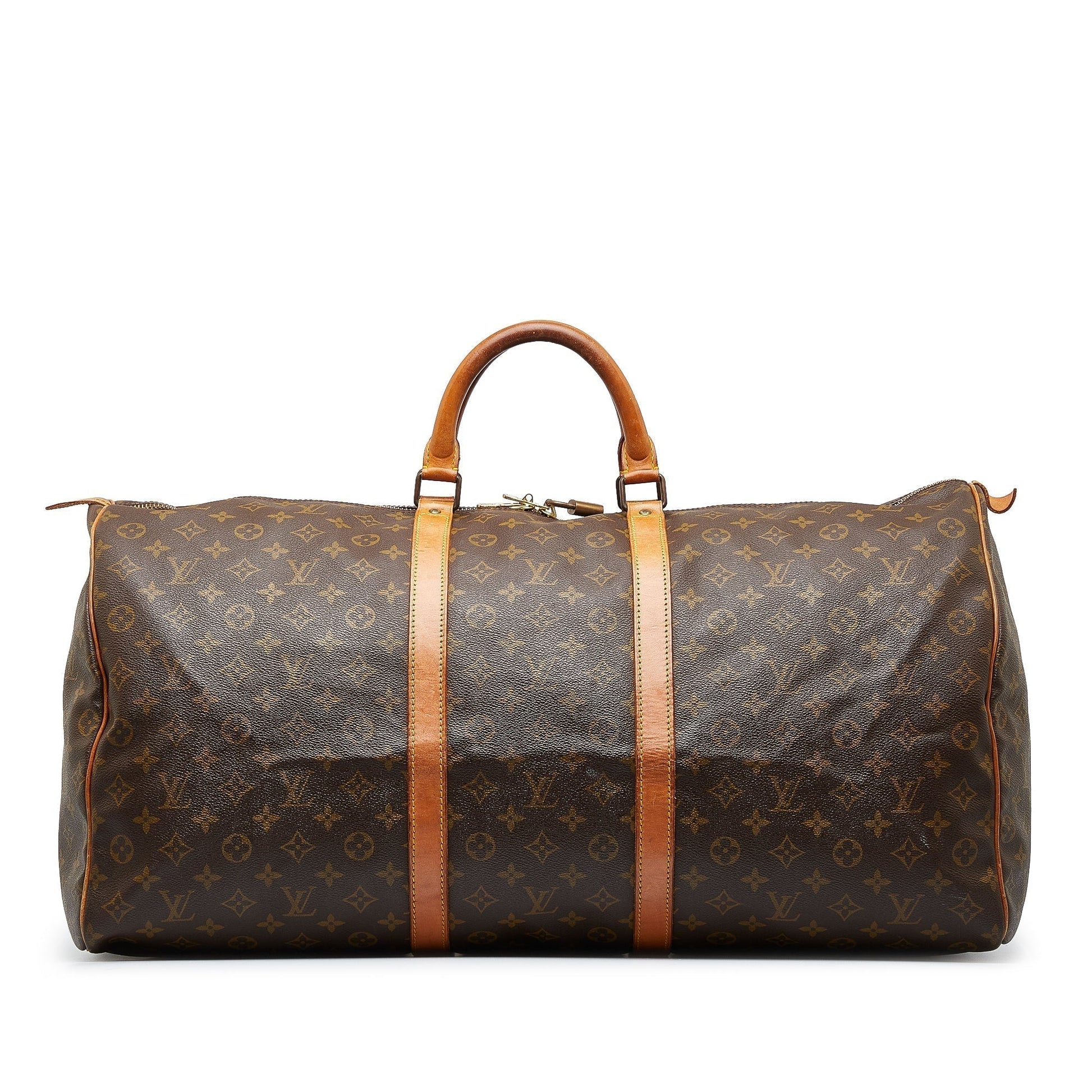 The Keepall 60 features a monogram canvas body, rolled vachetta handles, vachetta trim, and a two-way top zip closure.