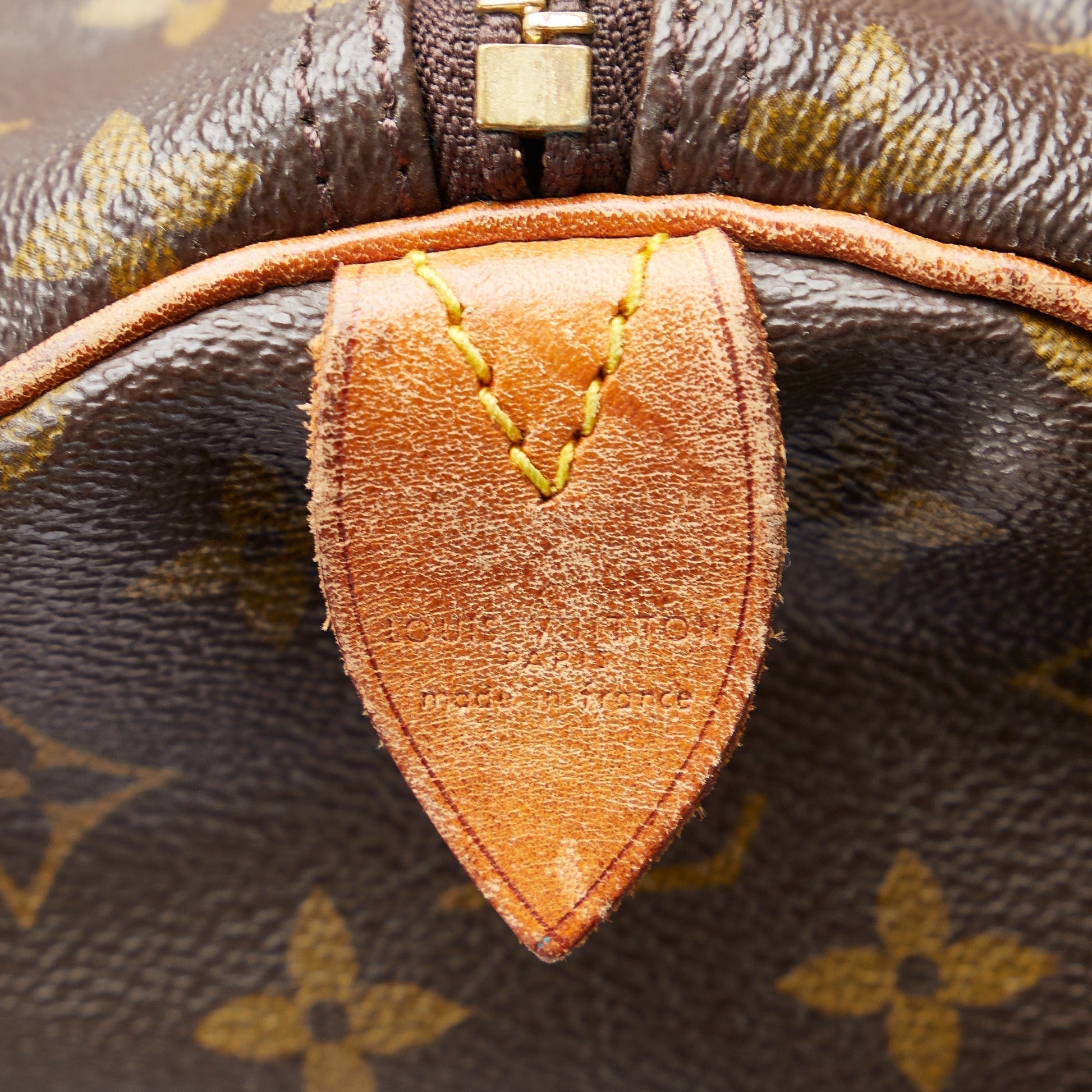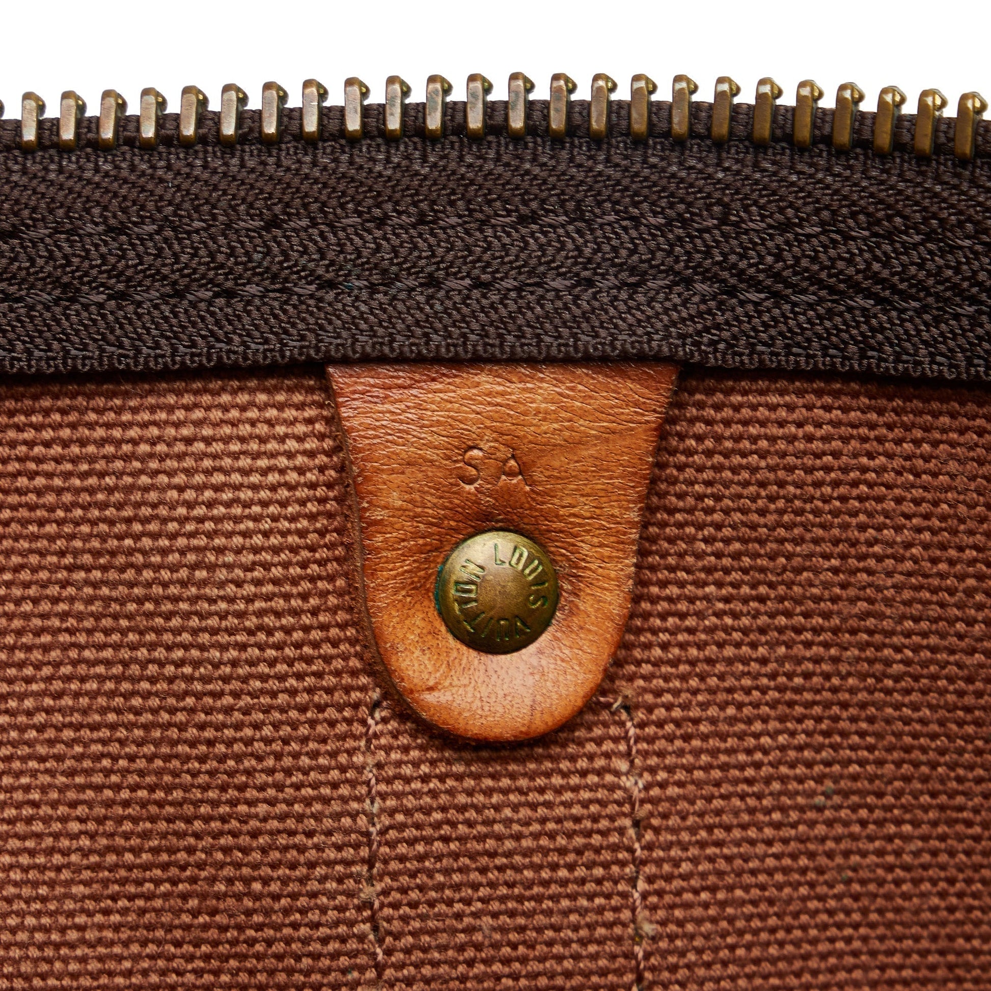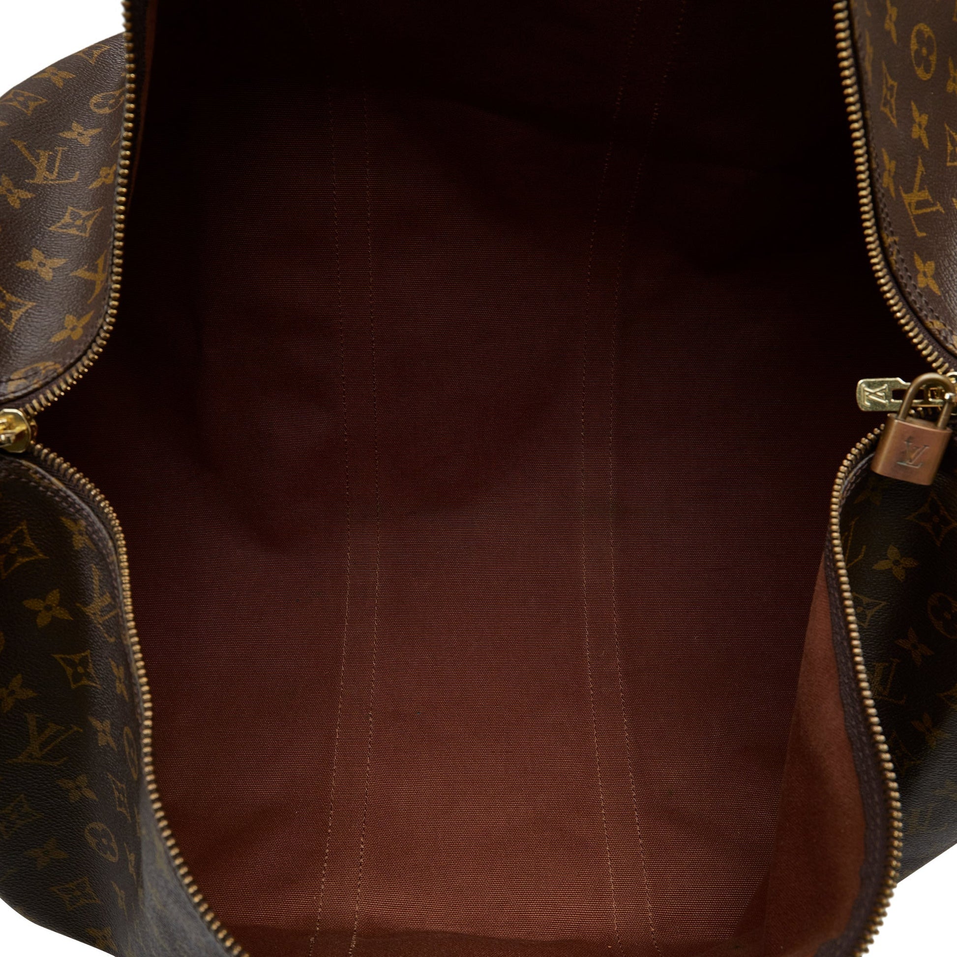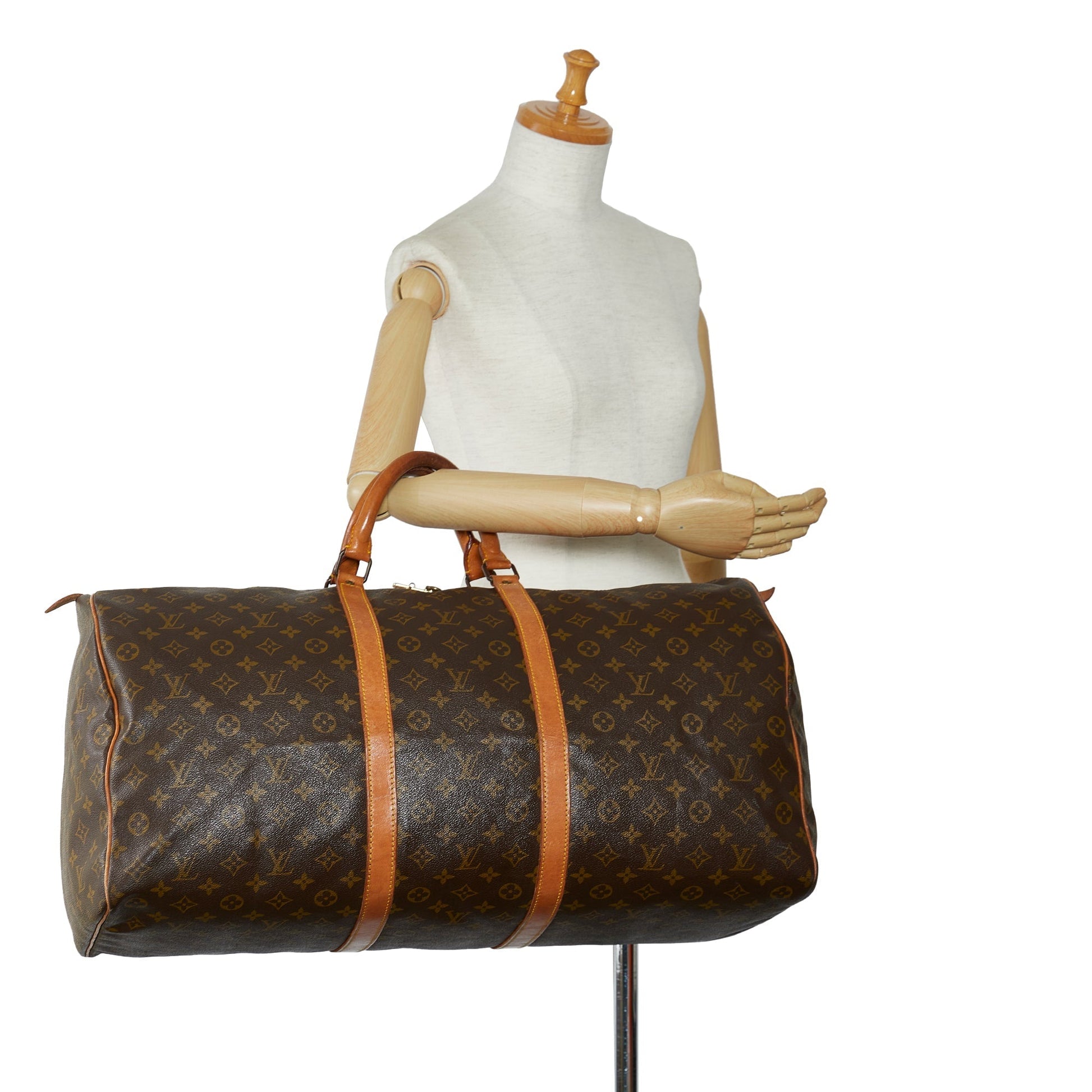The Keepall 60 features a monogram canvas body, rolled vachetta handles, vachetta trim, and a two-way top zip closure.