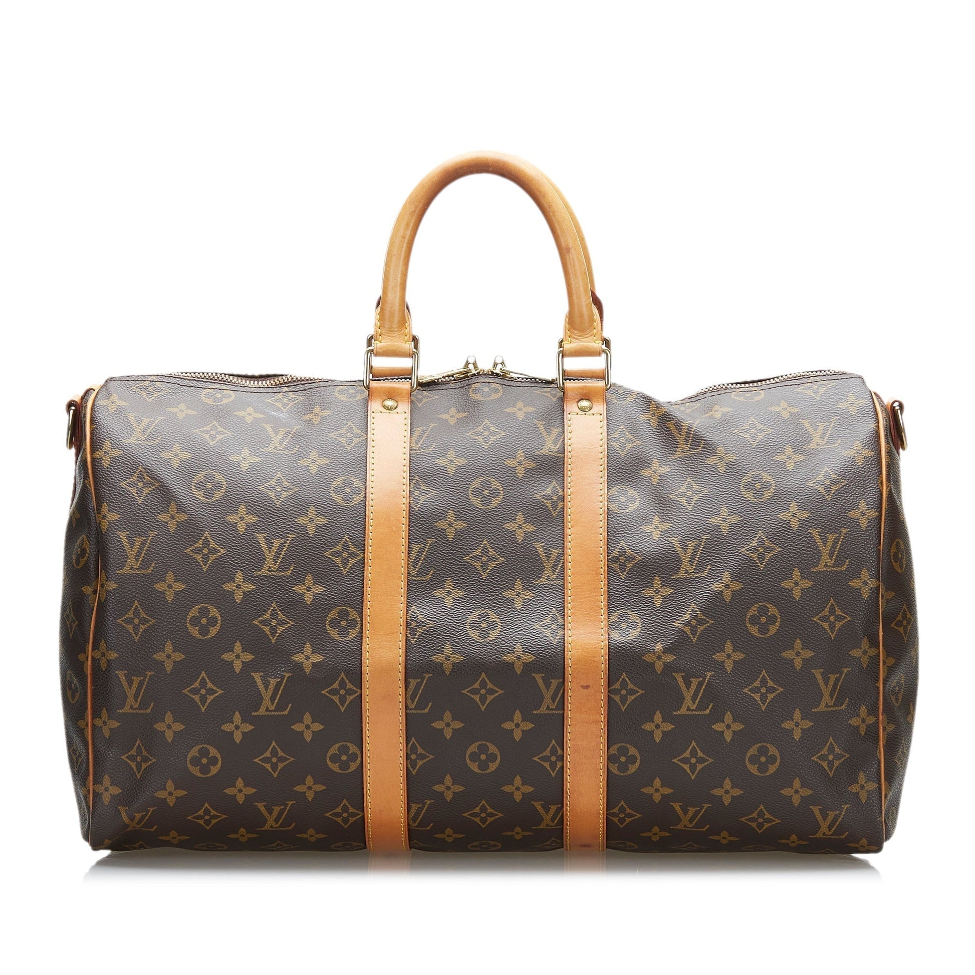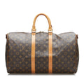 The Keepall Bandouliere 45 a monogram canvas body, a detachable shoulder strap, rolled leather handles, and an open top.