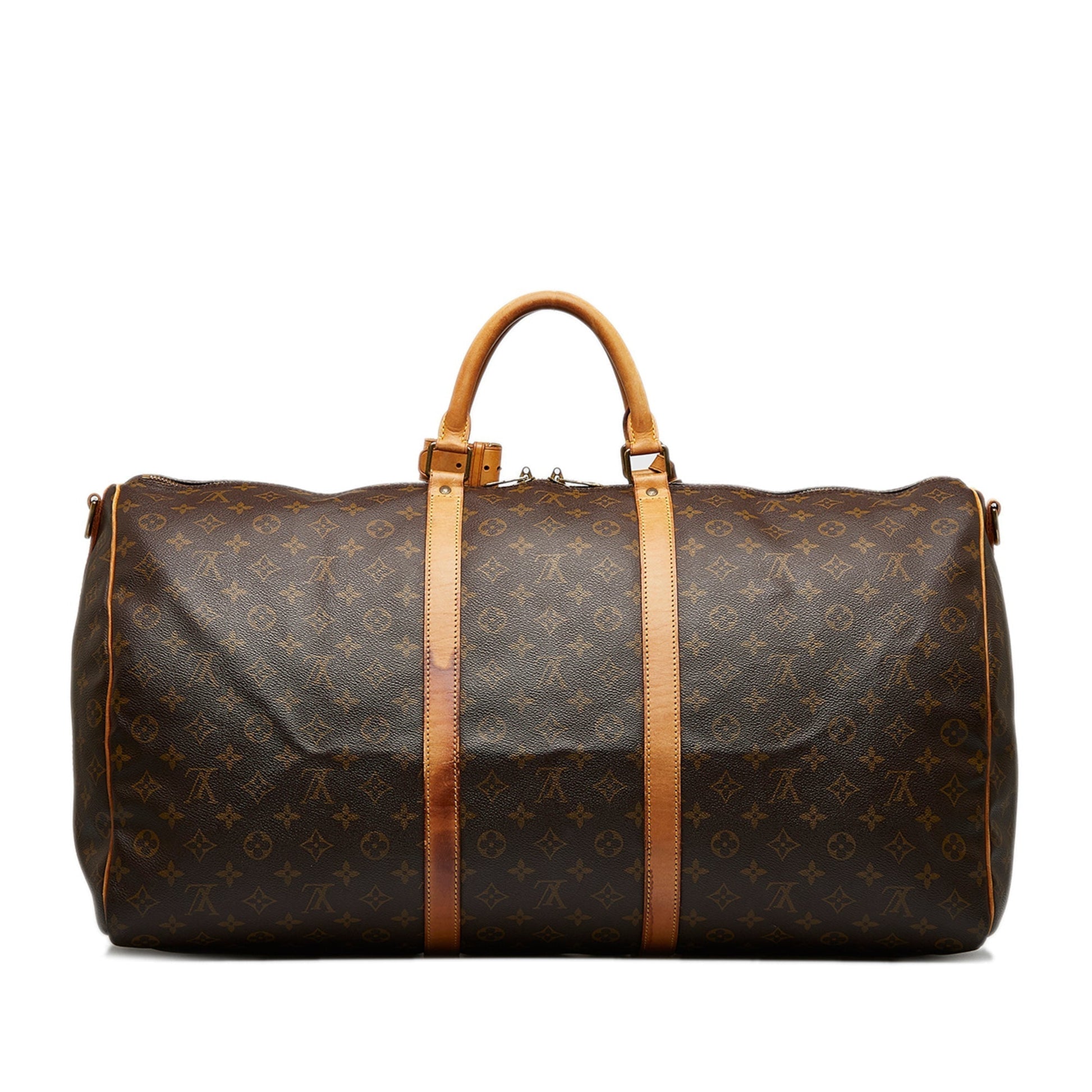 The Keepall Bandouliere 60 features a monogram canvas body, rolled vachetta leather handles, a detachable flat leather shoulder strap, and a top zip closure.