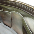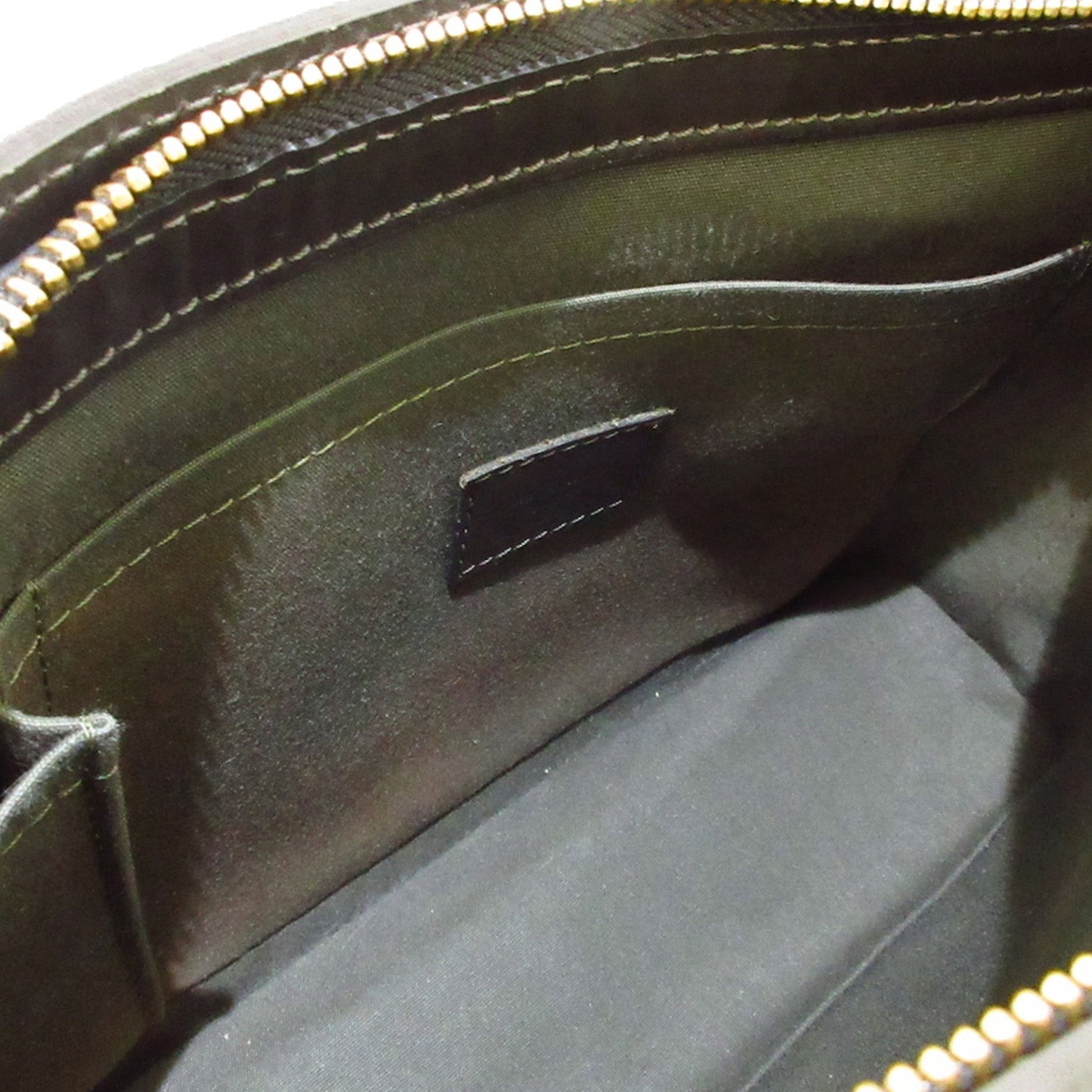 The Lucille PM features a monogram mini lin canvas body, flat leather straps, a top zip closure, an exterior front zip pocket, and interior slip pockets.