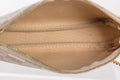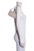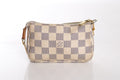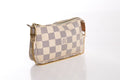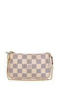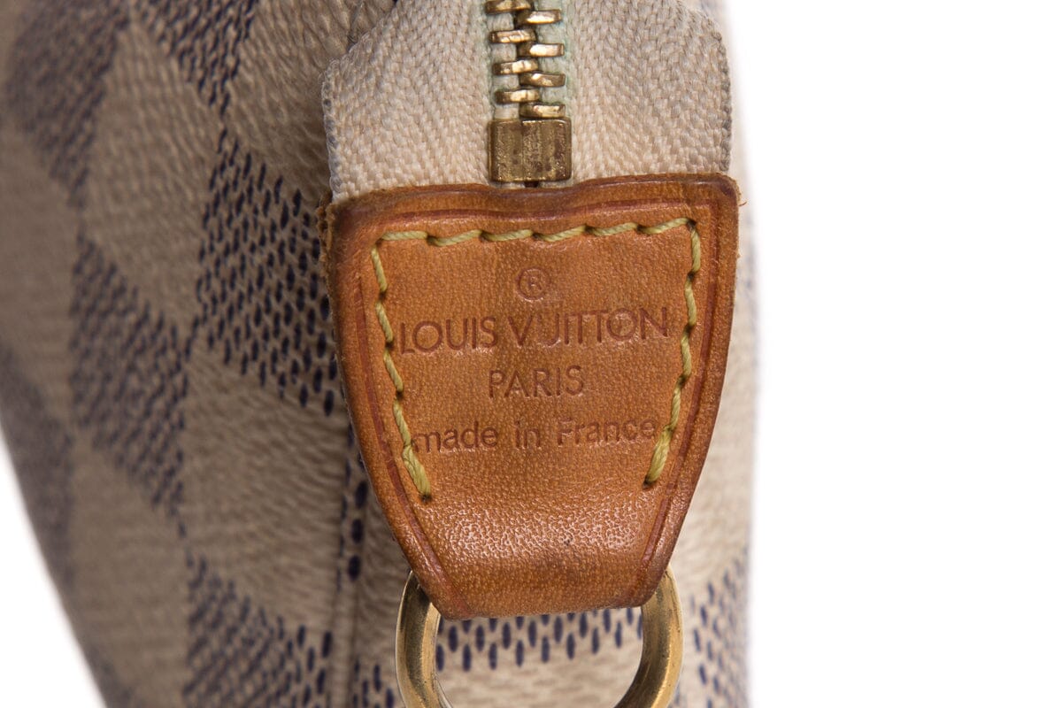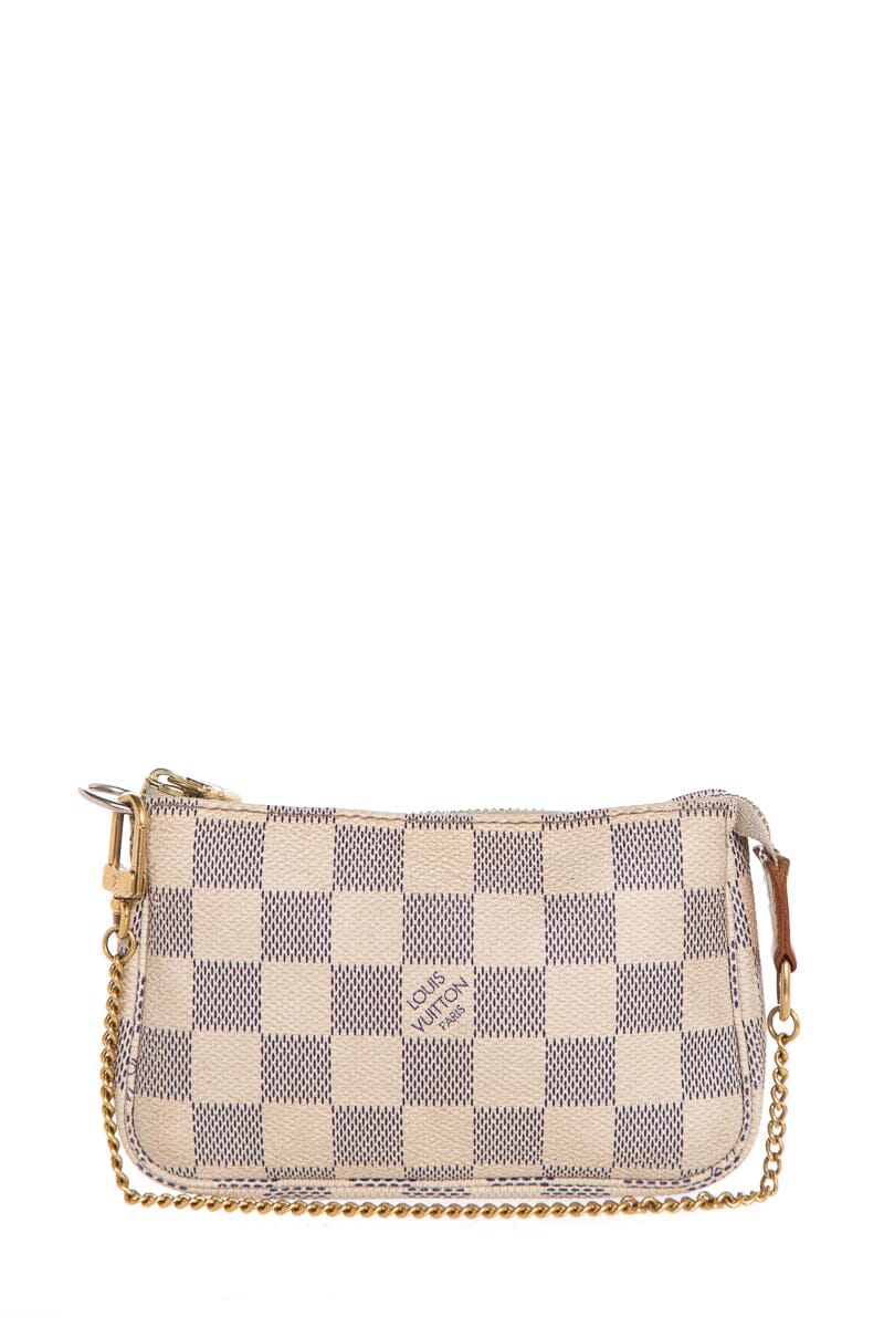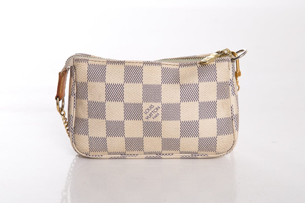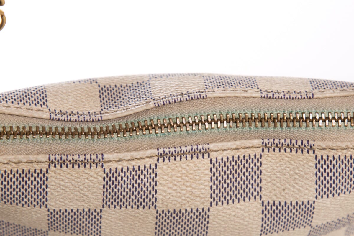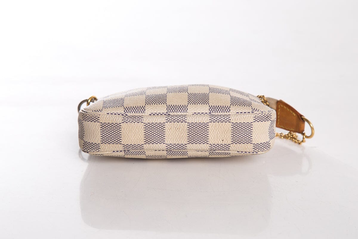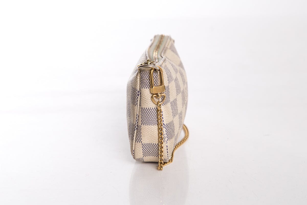Louis Vuitton Monogram Mini Pochette Damier Azur Shoulder Bag with gold chain link shoulder strap; slight wear on hardware and fabric where zipper is attached.