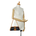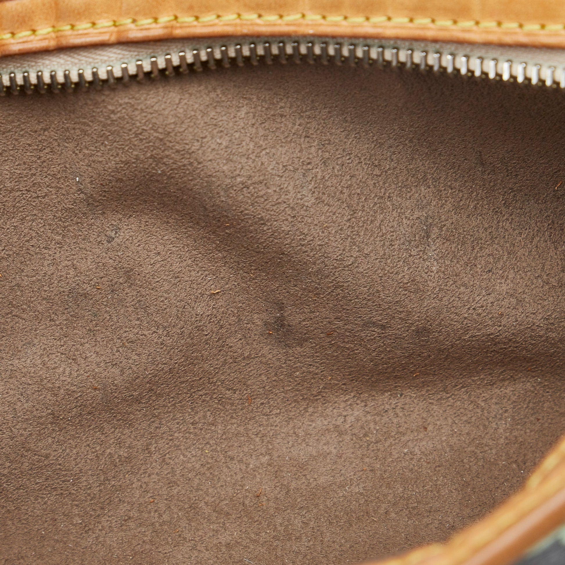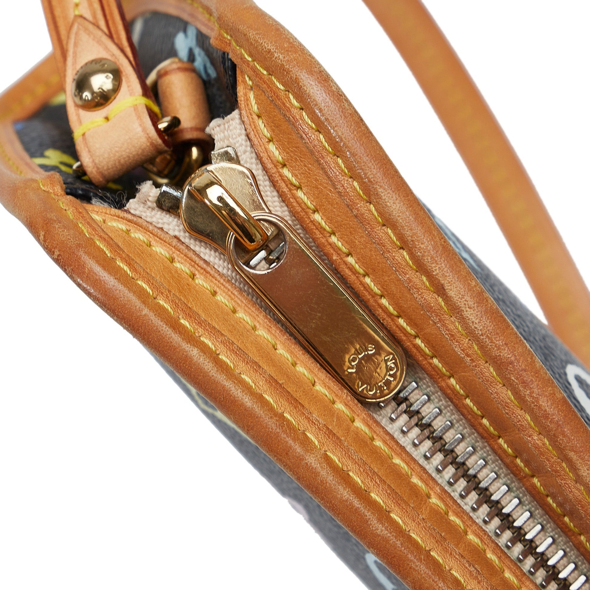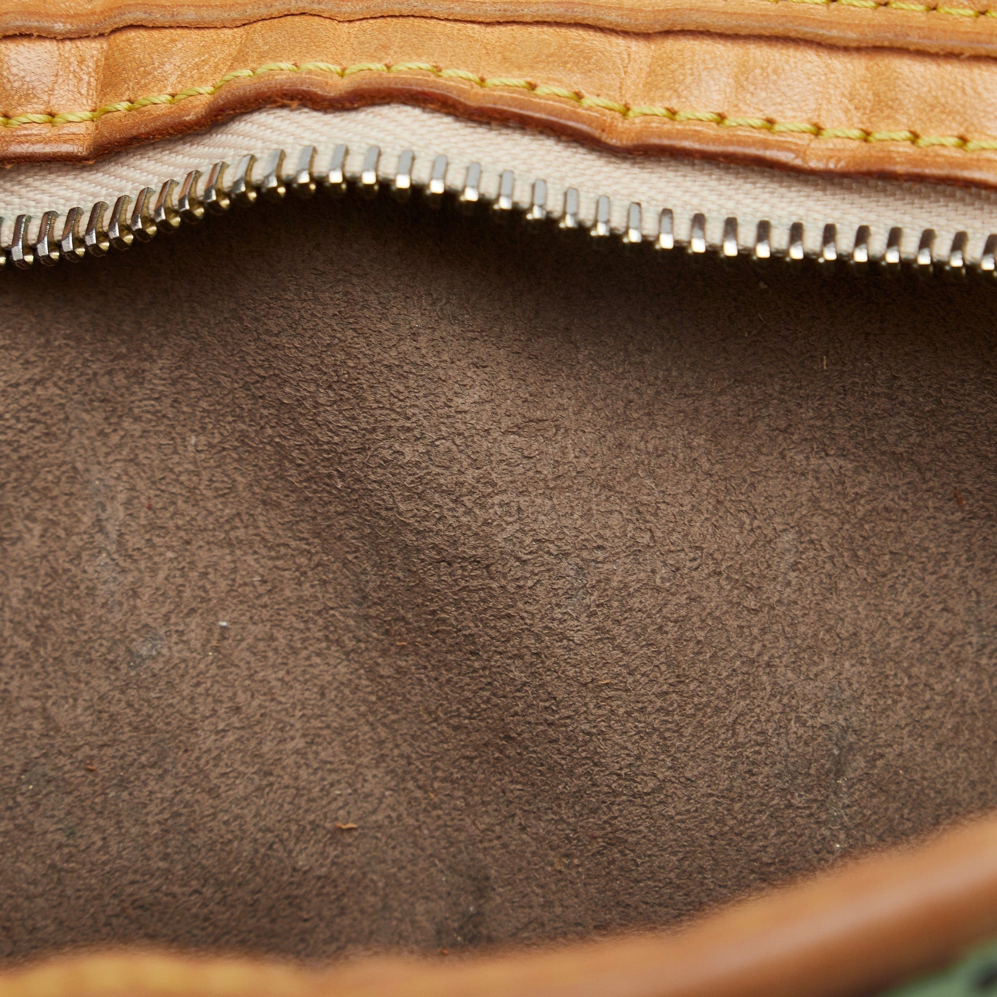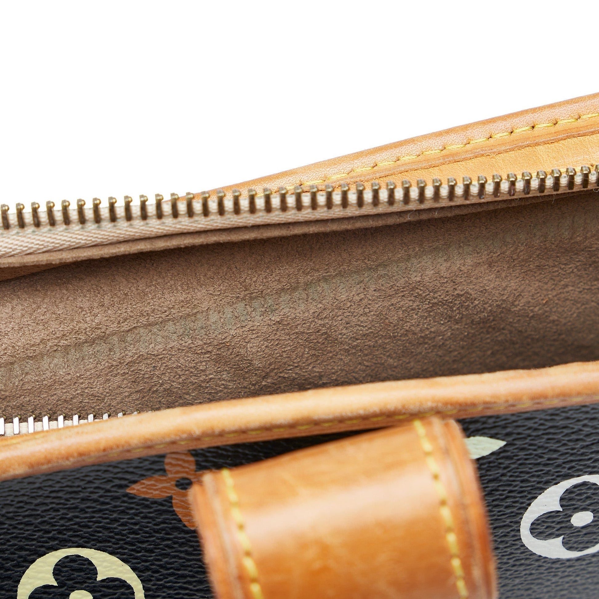 The Shirley features a monogram multicolore canvas body, a removable flat vachetta leather strap, a front strap with push lock closure, and a top zip closure.
