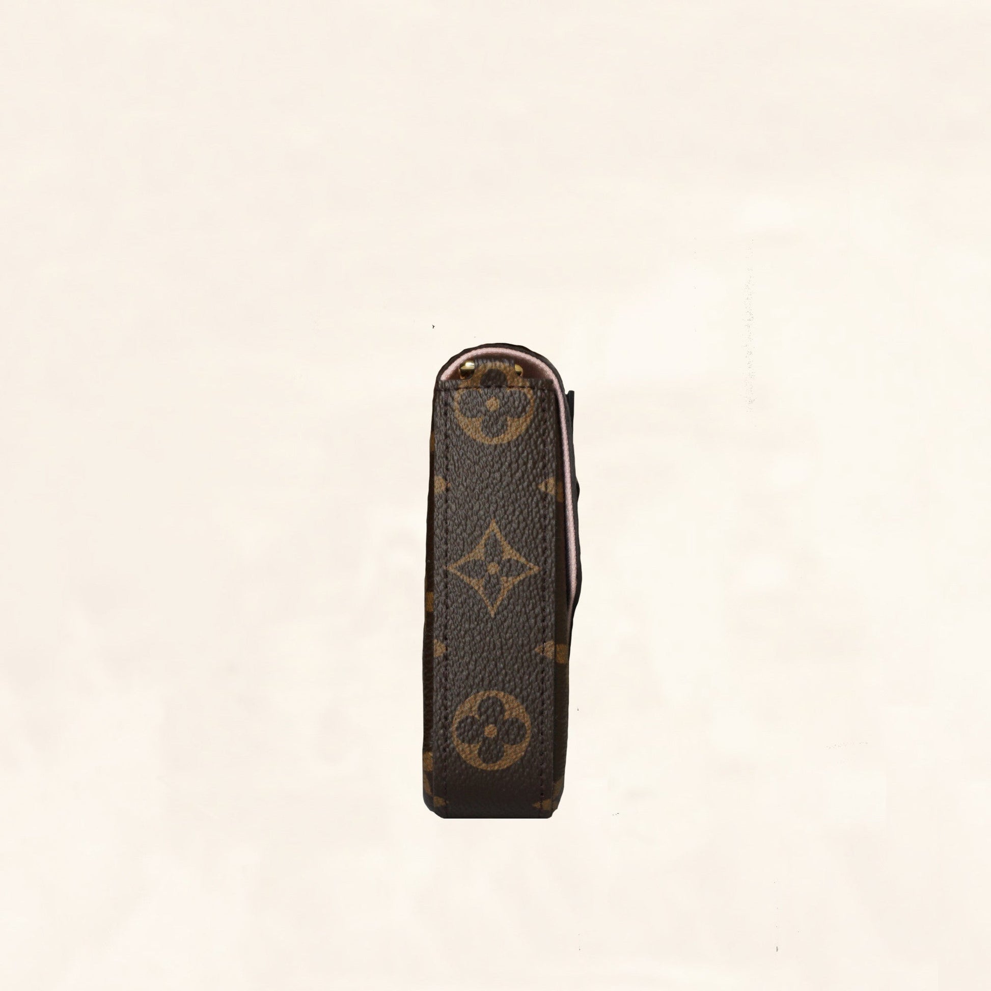 Characteristics: This wallet on a chain is crafted of Louis Vuitton monogram toile coated canvas. This shoulder bag features an owl design canvas on the face a lovely gold chain link shoulder strap and an envelope style facing flap. The felicie opens to a pink fabric interior with a patch pocket.