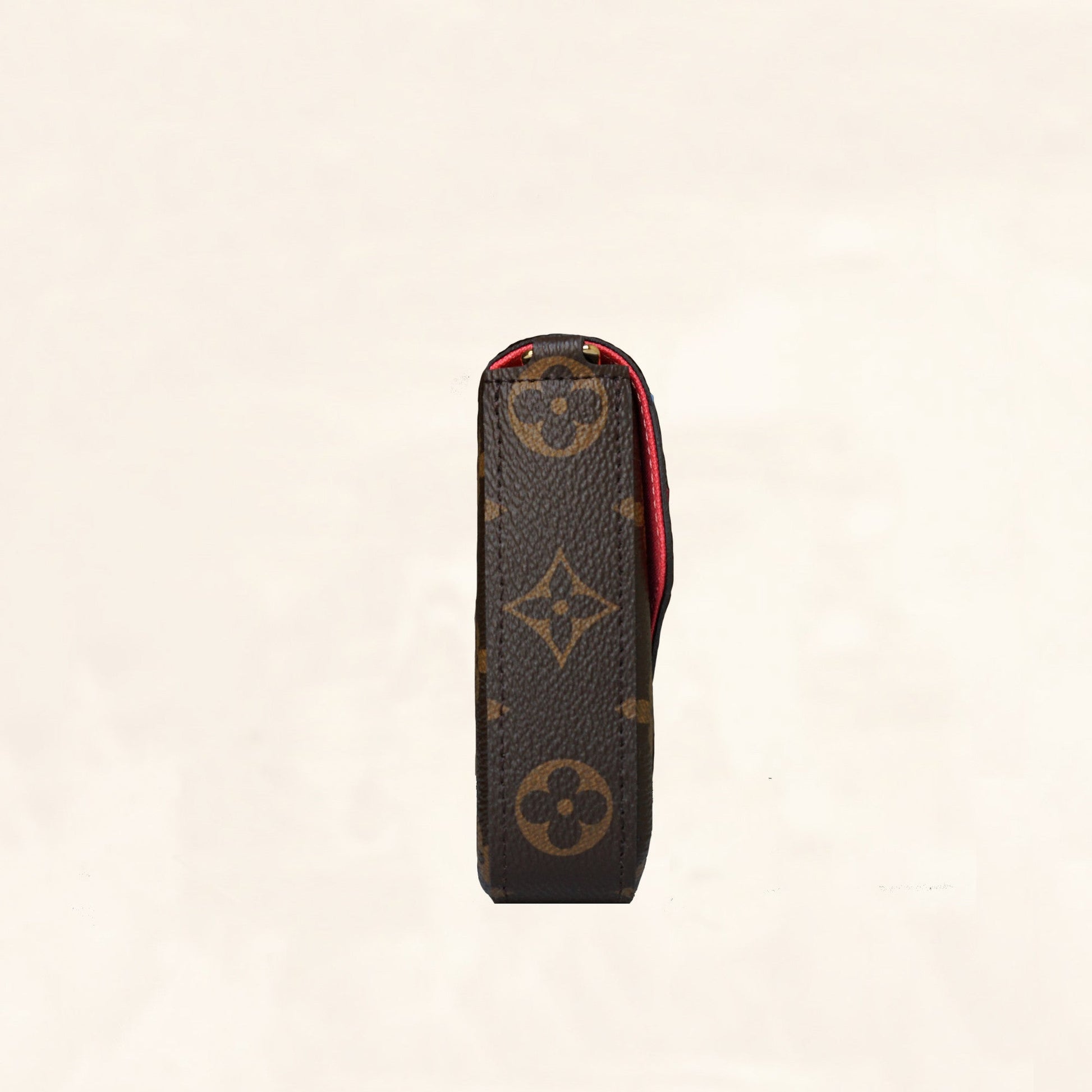 Characteristics: This wallet on a chain is crafted of Louis Vuitton monogram toile coated canvas. This shoulder bag features an owl design canvas on the face a lovely gold chain link shoulder strap and an envelope style facing flap. The felicie opens to a bright red fabric interior with a patch pocket.