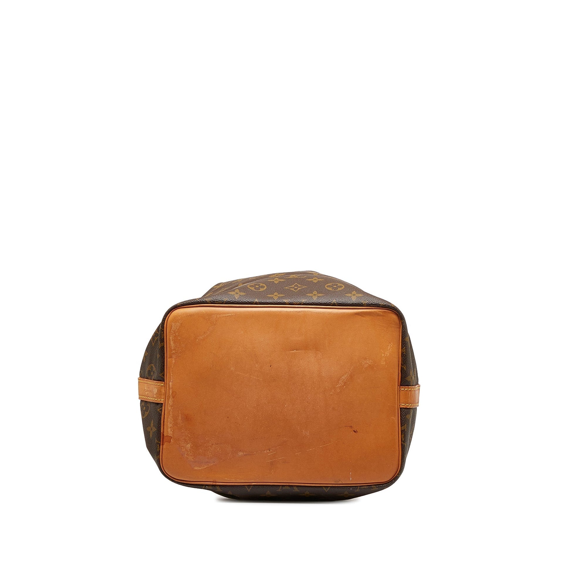 The Petit Noe features a monogram canvas body, an adjustable flat leather strap, and a top drawstring closure.