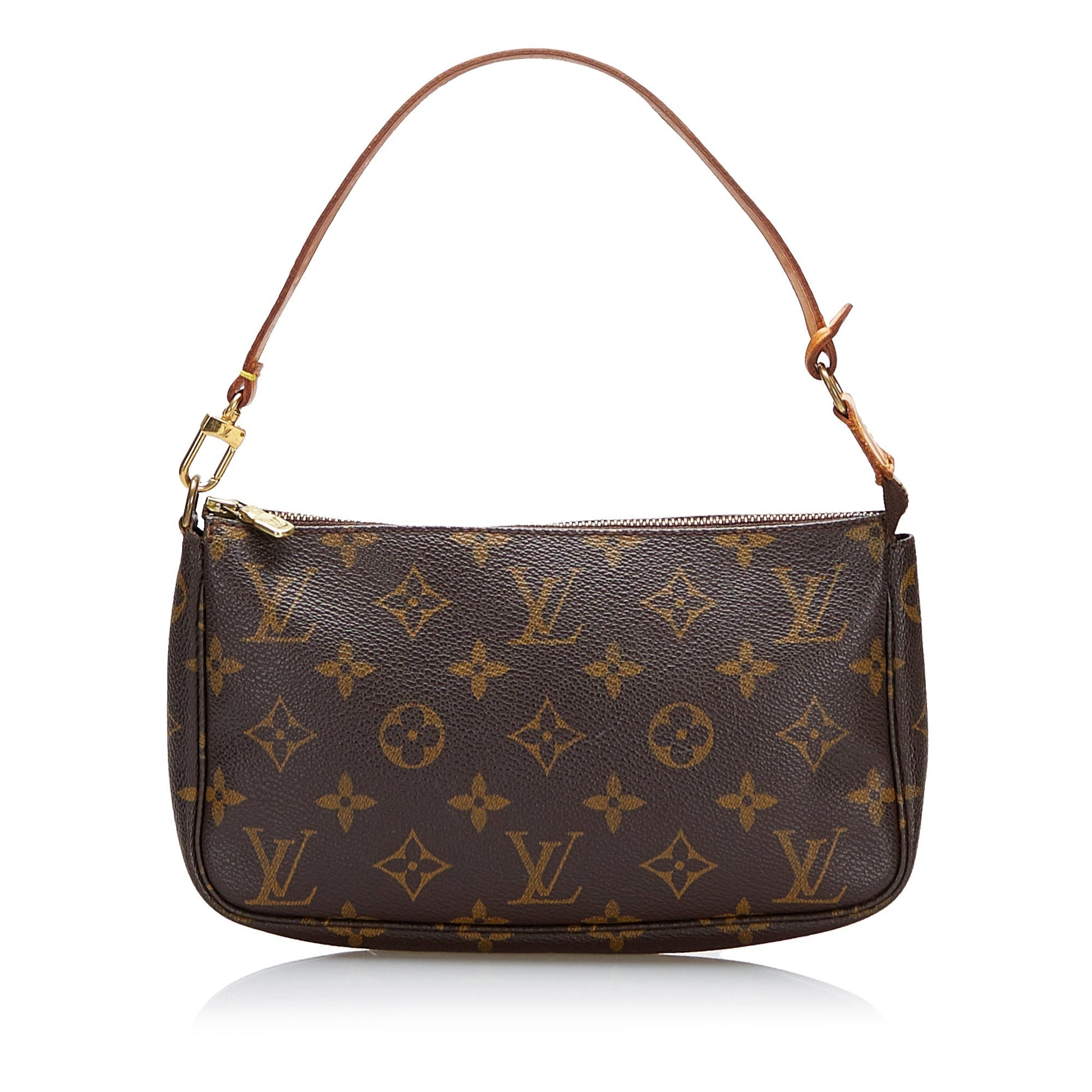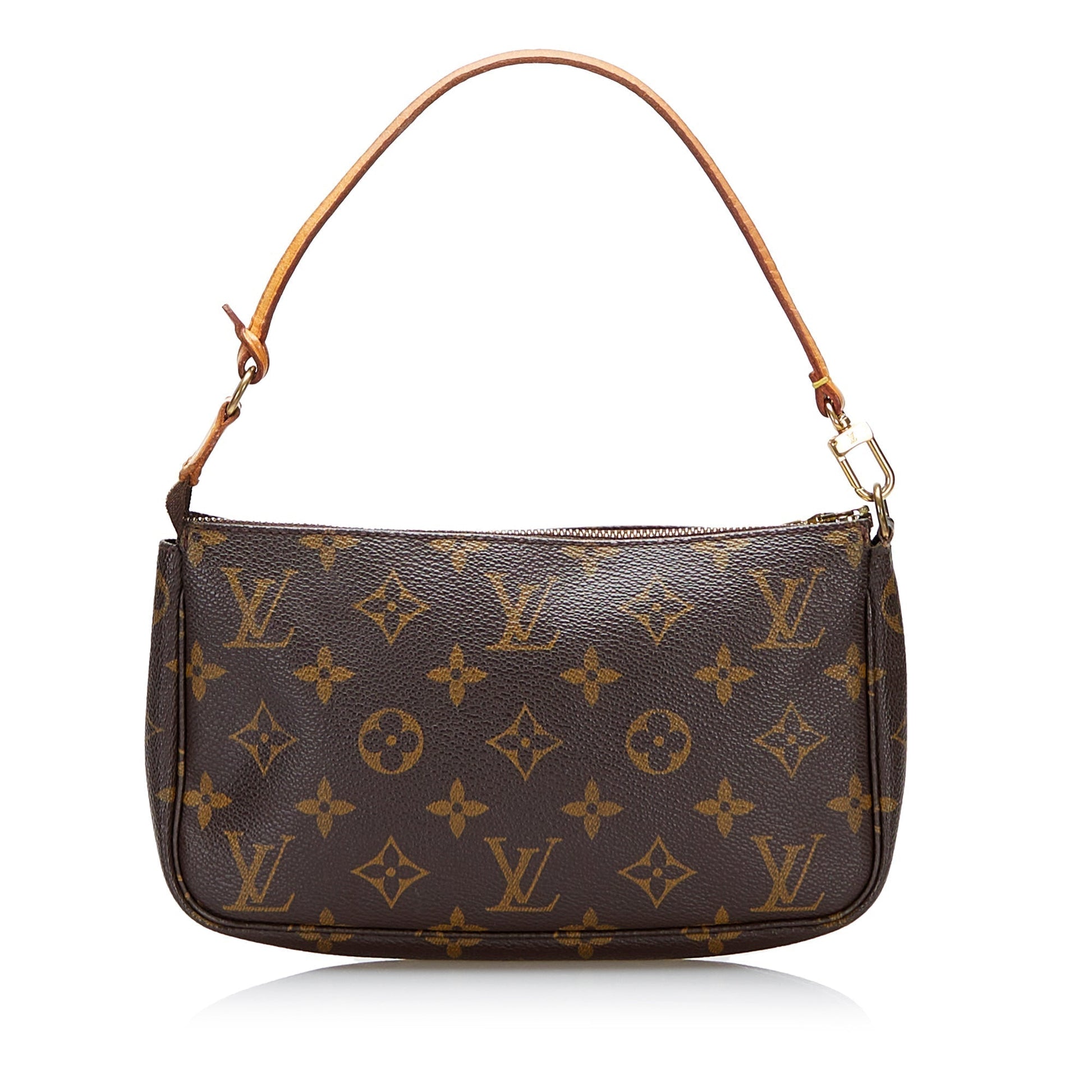 The Pochette Accessoires features a Monogram canvas body, a flat vachetta leather shoulder strap, and a top zip closure.