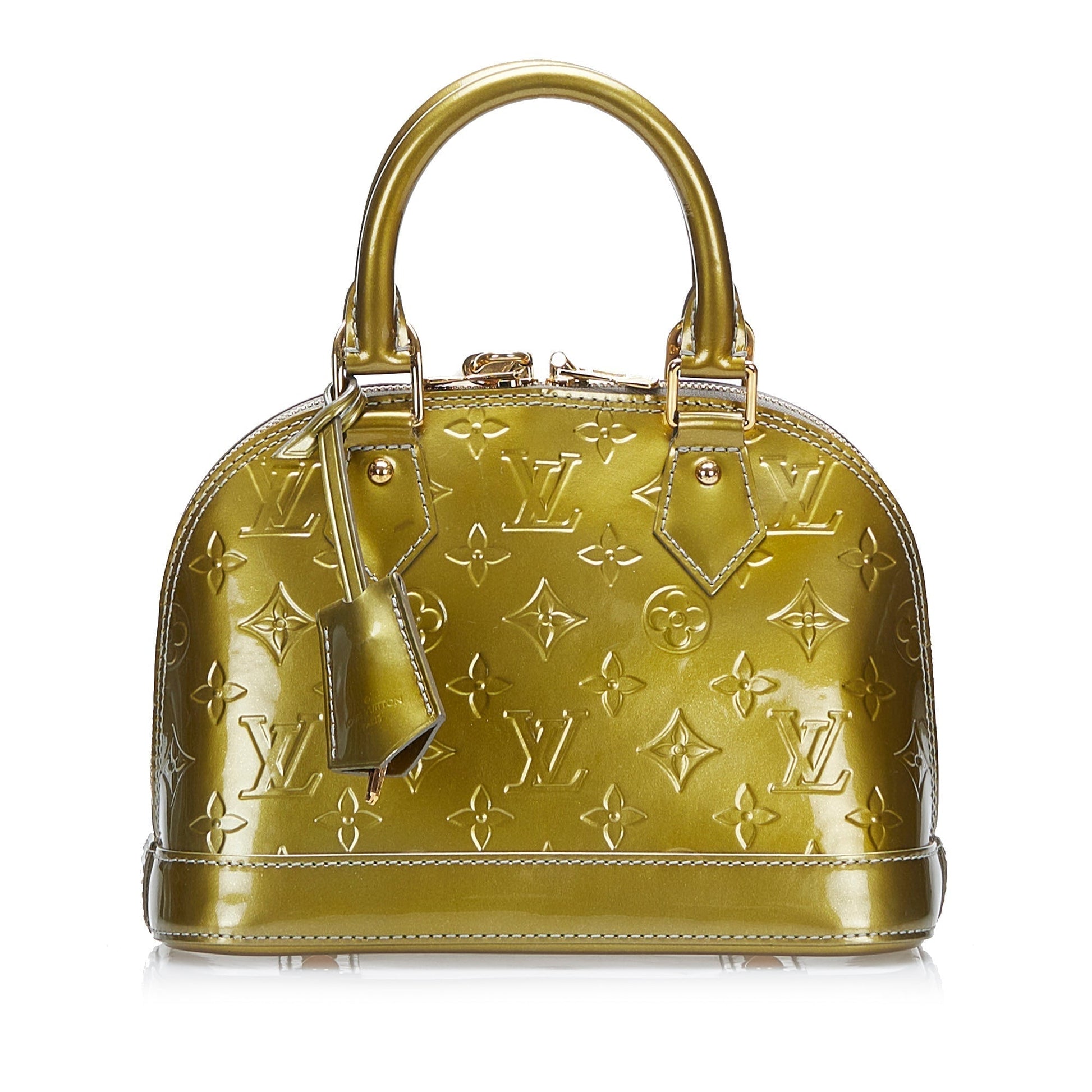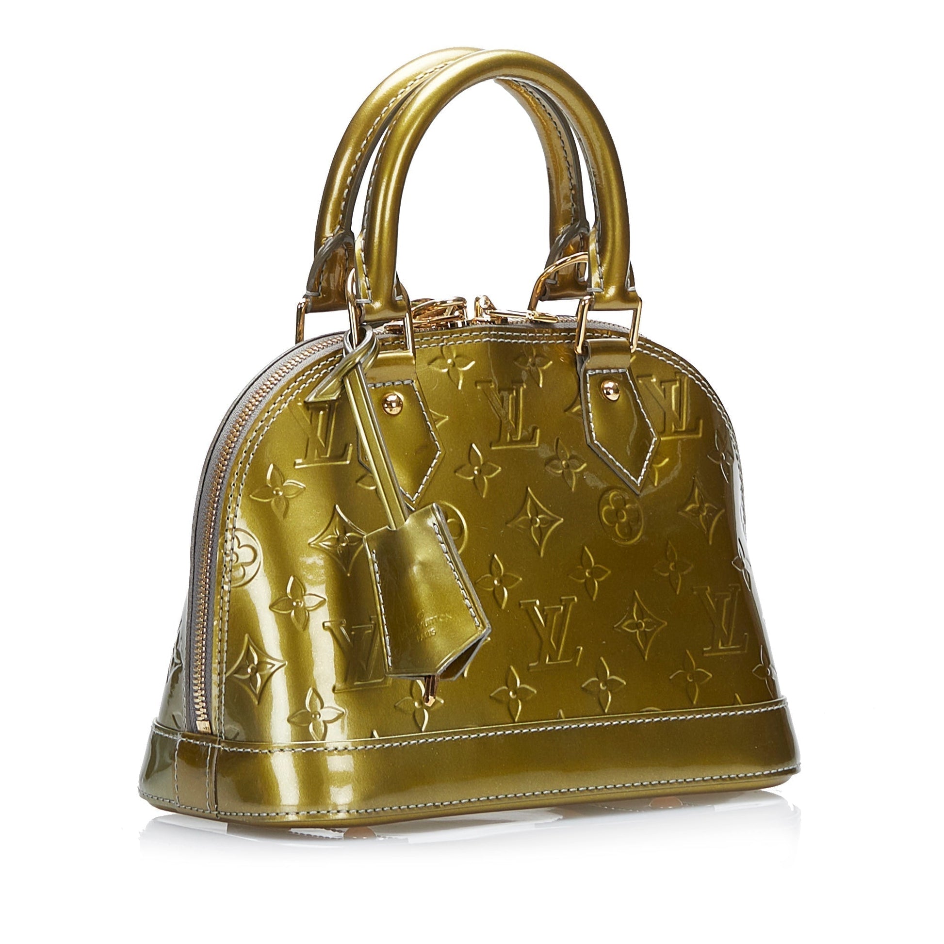 The Monogram Vernis Alma BB is crafted of Monogram Vernis Leather in gold tone, rolled leather handles, a detachable flat leather strap, a top zip closure, and an interior slip pocket.
