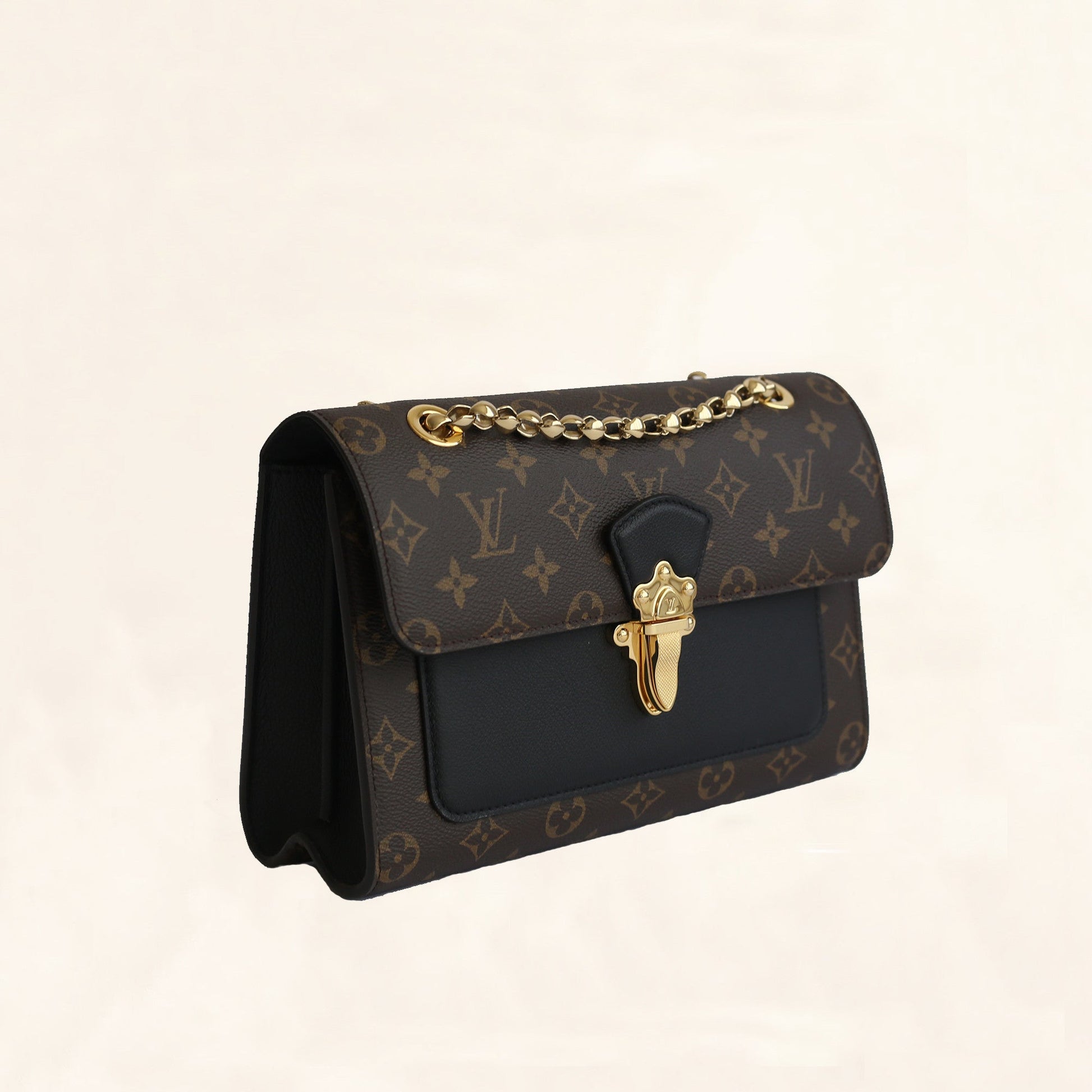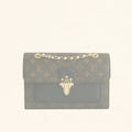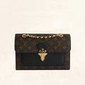 Characteristics: The Victoire bag Monogram coated canvas with calfskin opens up to a microfiber lining. It features gold-colour metallic pieces, a long sliding chain, and clasp closure.