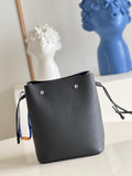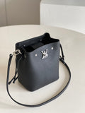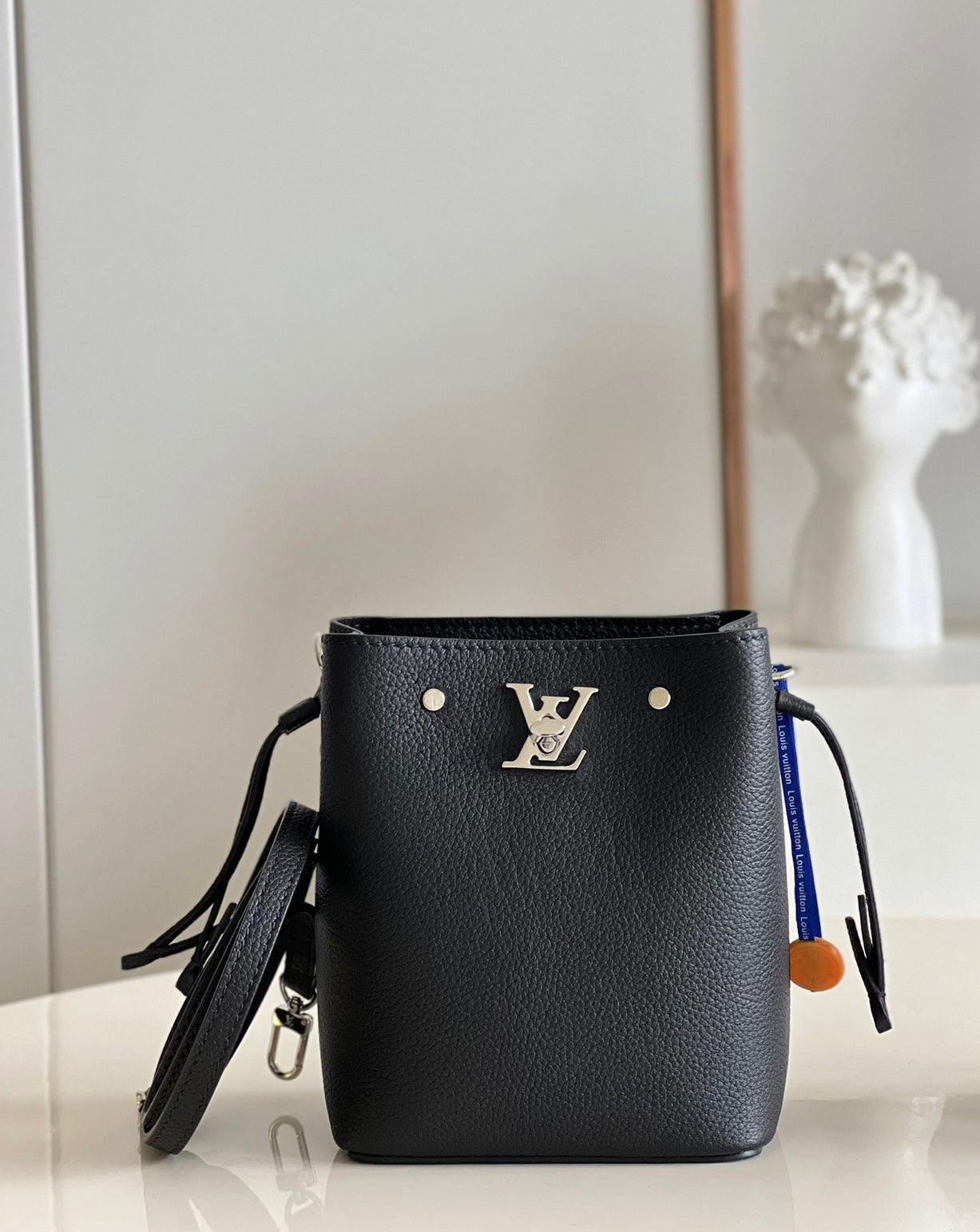 A miniature reinterpretation of the Lockme Bucket, the Nano Lockme Bucket bag is crafted from exceptionally supple black grained calfskin. This tiny, lightweight companion can be carried on the shoulder or across the body. Its sleek design is complemented by a secure LV twist lock in silver-tone metal.