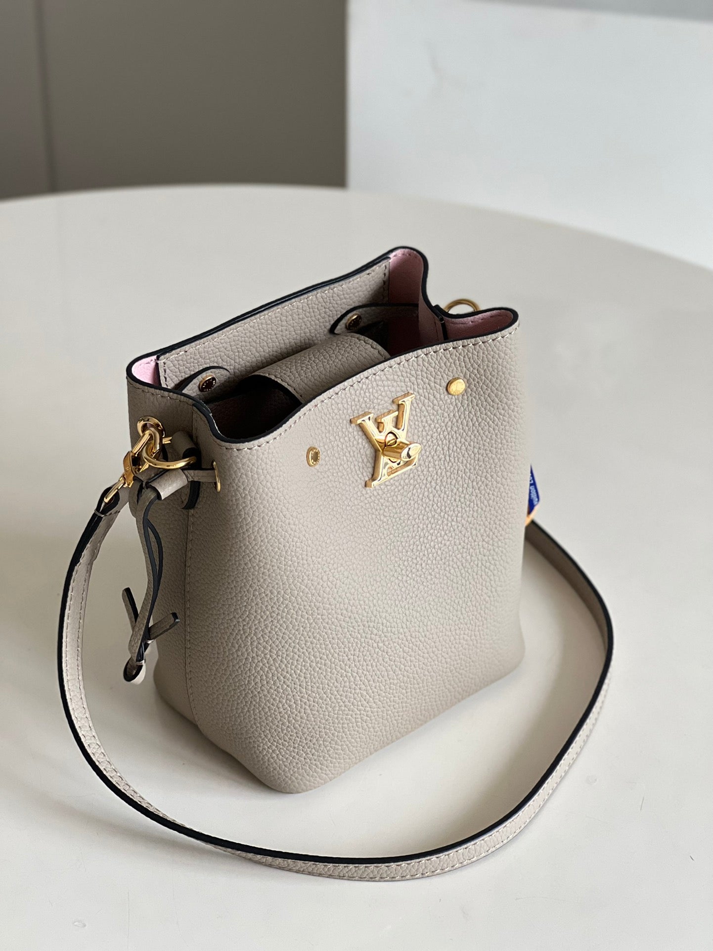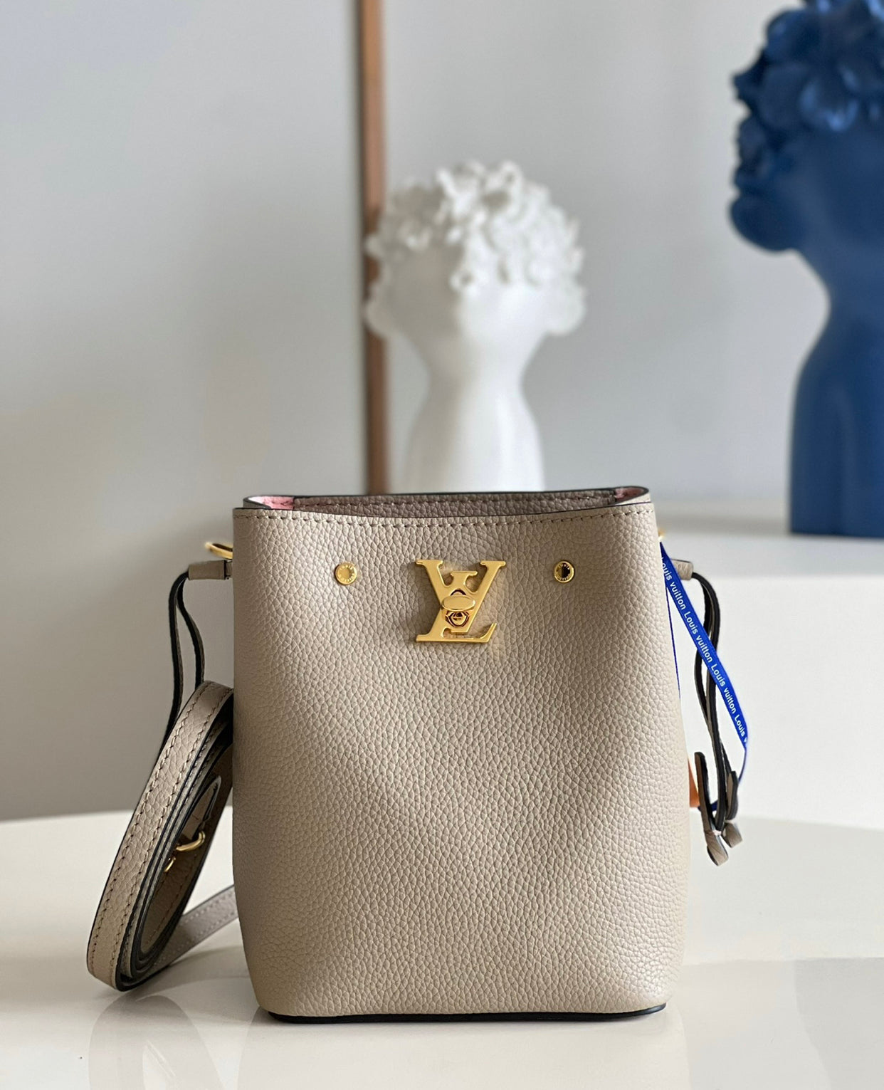A miniature reinterpretation of the Lockme Bucket, the Nano Lockme Bucket bag is crafted from exceptionally supple black grained calfskin. This tiny, lightweight companion can be carried on the shoulder or across the body. Its sleek design is complemented by a secure LV twist lock in silver-tone metal.