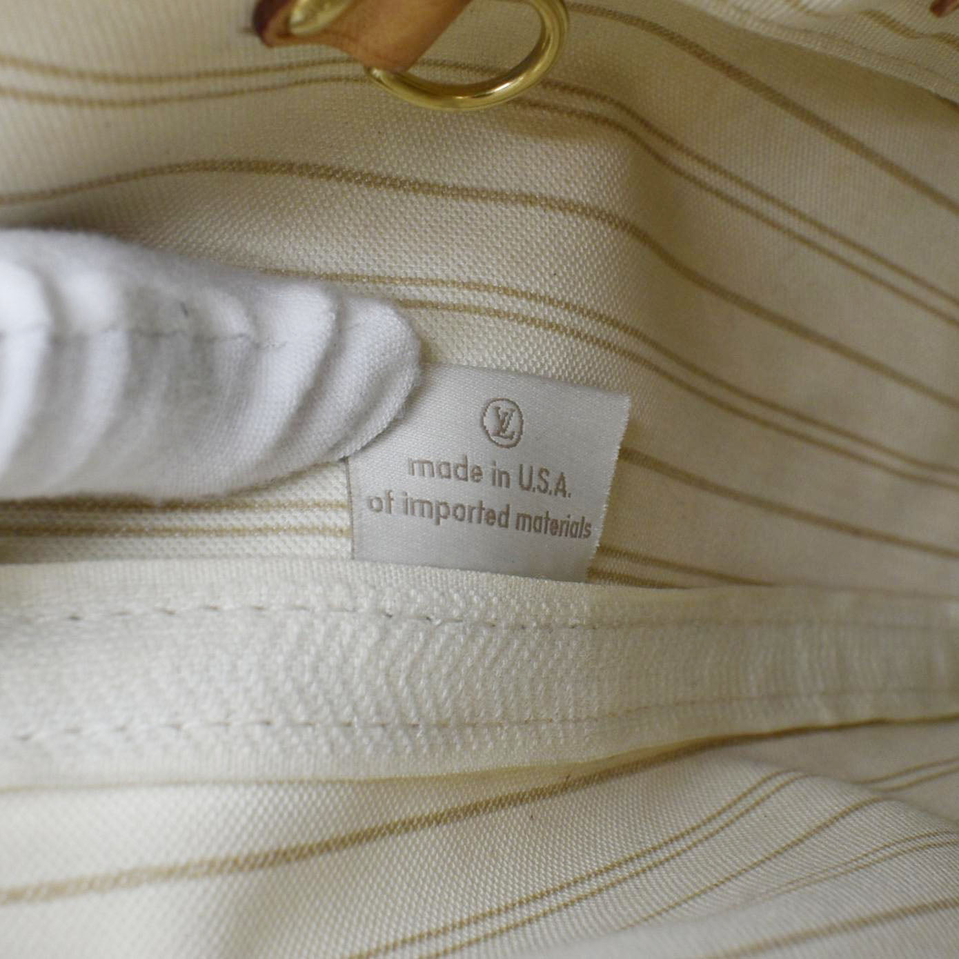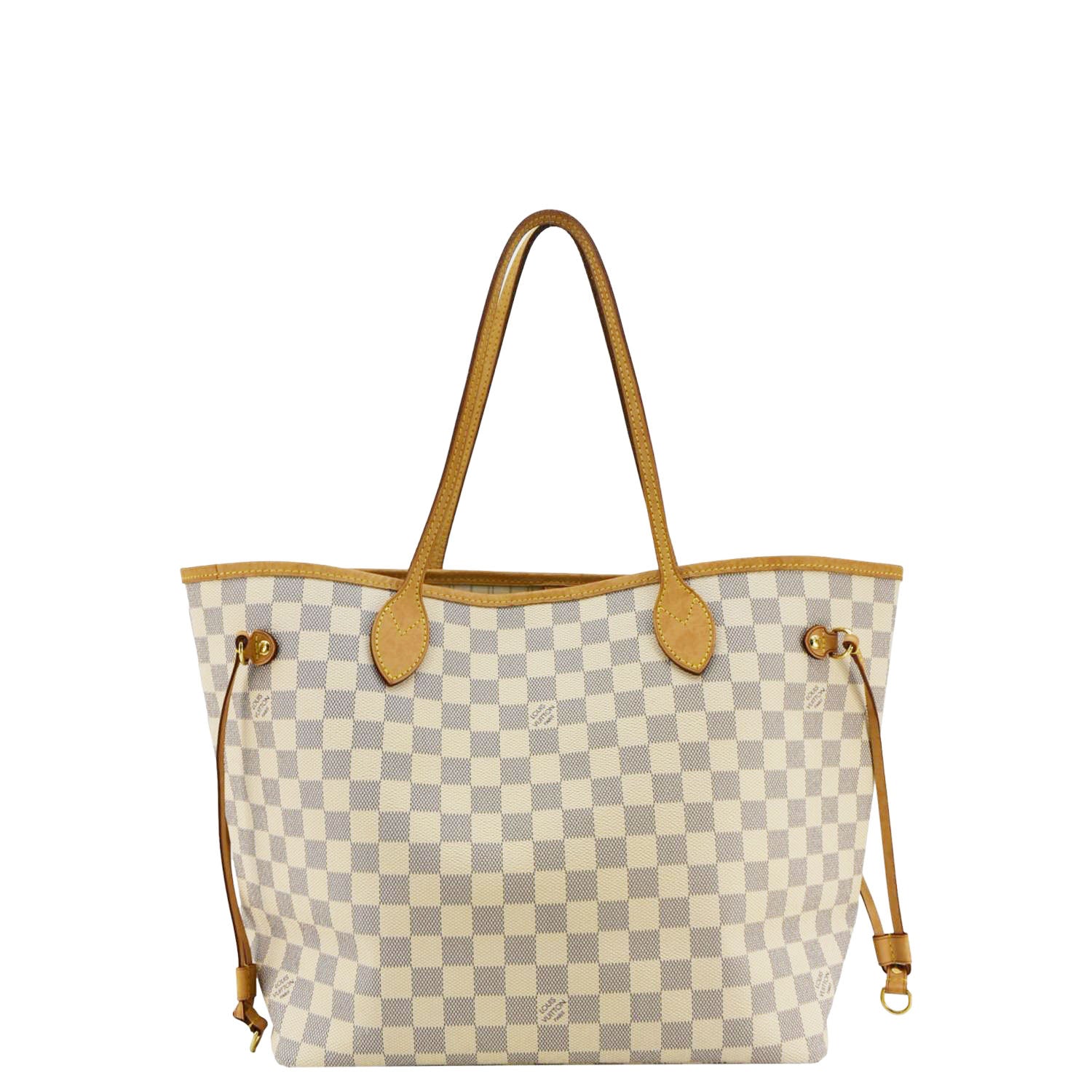 The Louis Vuitton Neverfull MM Damier Azur Shoulder Bag in White features the iconic Damier Azur canvas with natural cowhide trim and a spacious interior, making it perfect for everyday use.