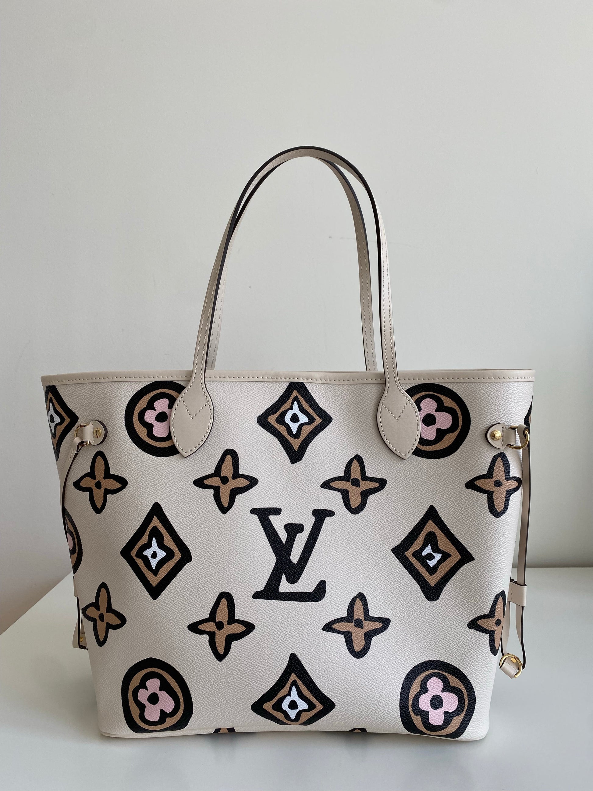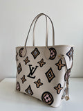 Characteristics: The Neverfull MM tote is arrayed this season in an exclusive Monogram print inspired by an archival design. Part of the Wild at Heart capsule, it has a boldly graphic, hand-painted look. This roomy carryall can be slipped over the shoulder or elbow and comes with a separate zipped pouch that can serve as a clutch or extra pocket.