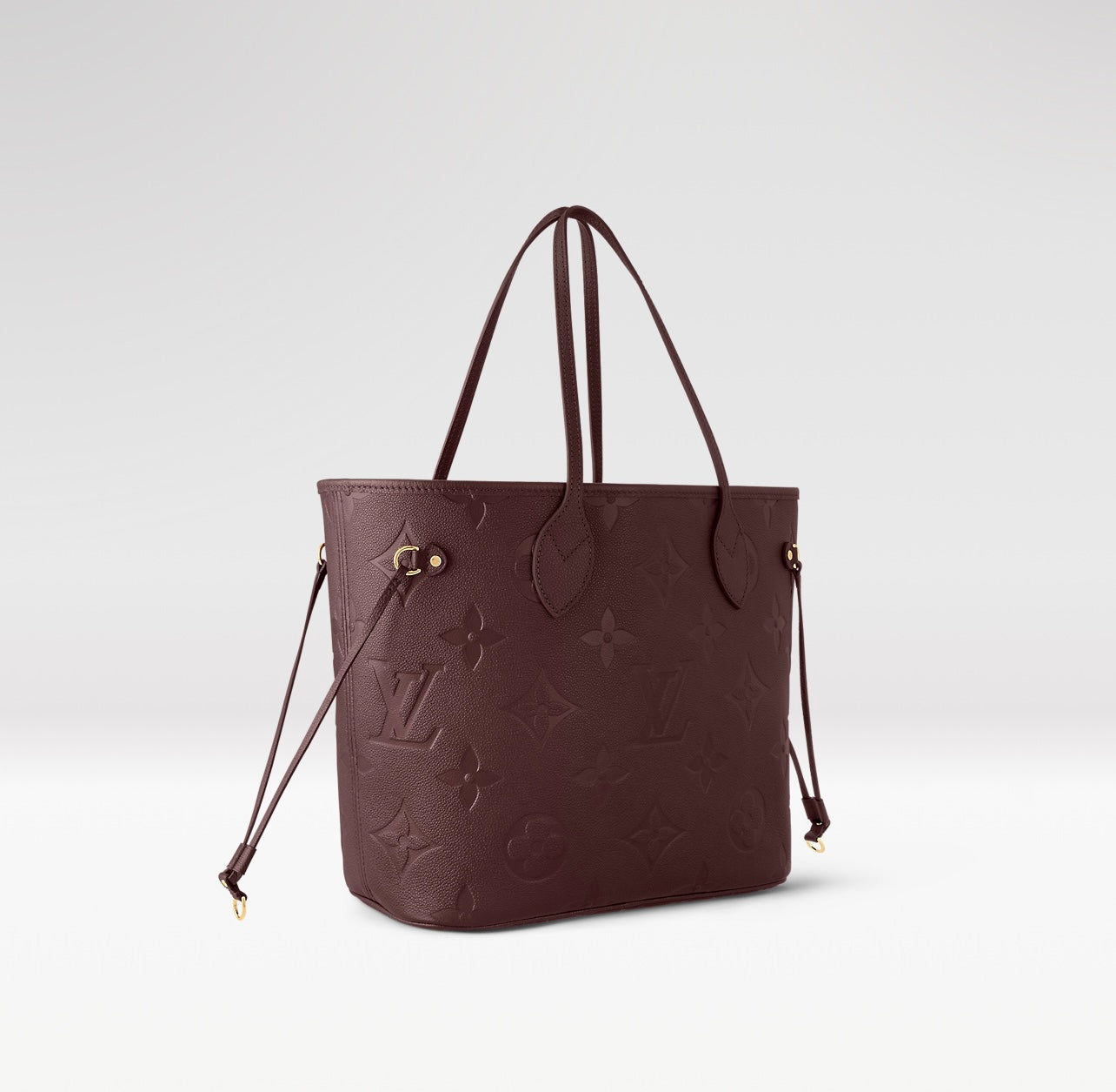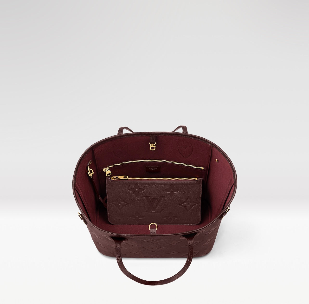 Characteristics: The essential Neverfull MM tote now comes in embossed Monogram Empreinte leather. Its generous dimensions make this bag ideal for everyday use while the long shoulder handles and supple leather mean it’s comfortable to carry. With the side laces cinched, this roomy carryall becomes a stylish city bag. It can be over the shoulder or on the elbow. The burgundy color on burgundy color neverfull is a sold out and highly sought after handbag that makes a great investment piece.