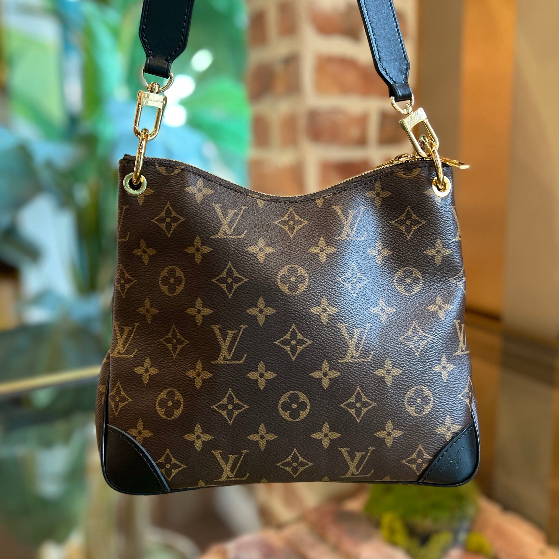 Designed from iconic Monogram coated canvas, this Louis Vuitton Odeon PM features black leather accents and a sleek crossbody strap for hands-free convenience. Its functional silhouette and timeless style make it perfect for everyday elegance. B+ Very Good Condition