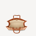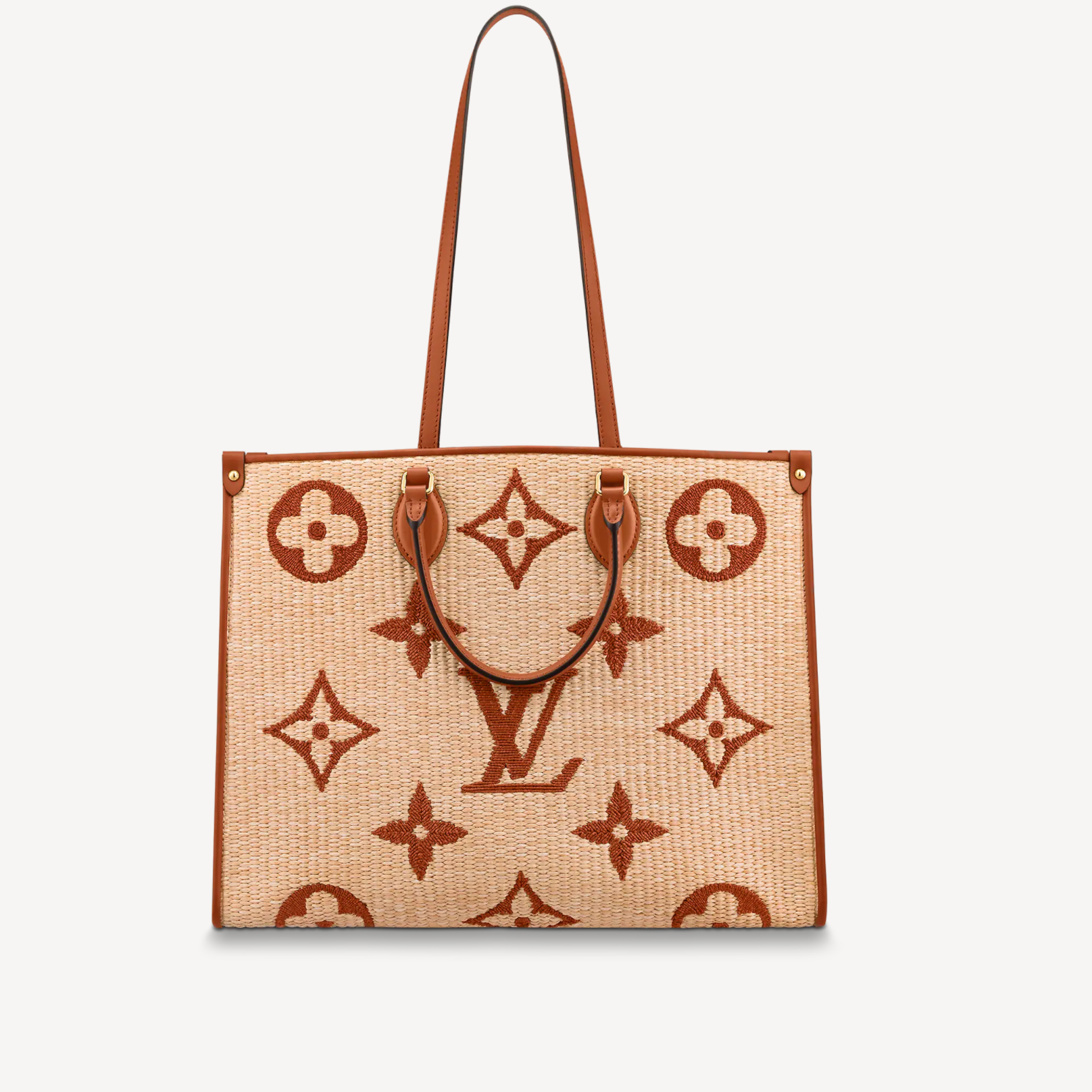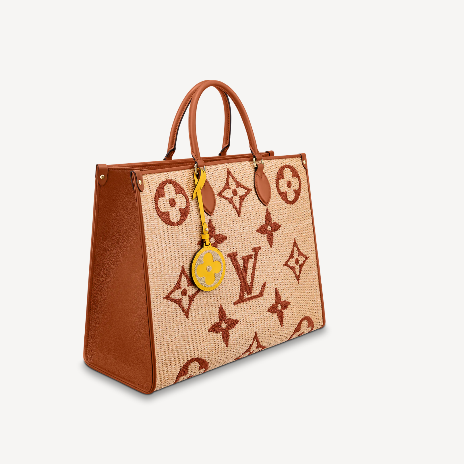 Characteristics: The OnTheGo GM tote bag is made from Monogram Raffia with natural leather handles, shoulder strap and gussets. The raffia-like woven textile base and refined Monogram Giant embroidery bring a casually natural feel to this bag. It features an exclusive Monogram Flower charm in a contrasting color.