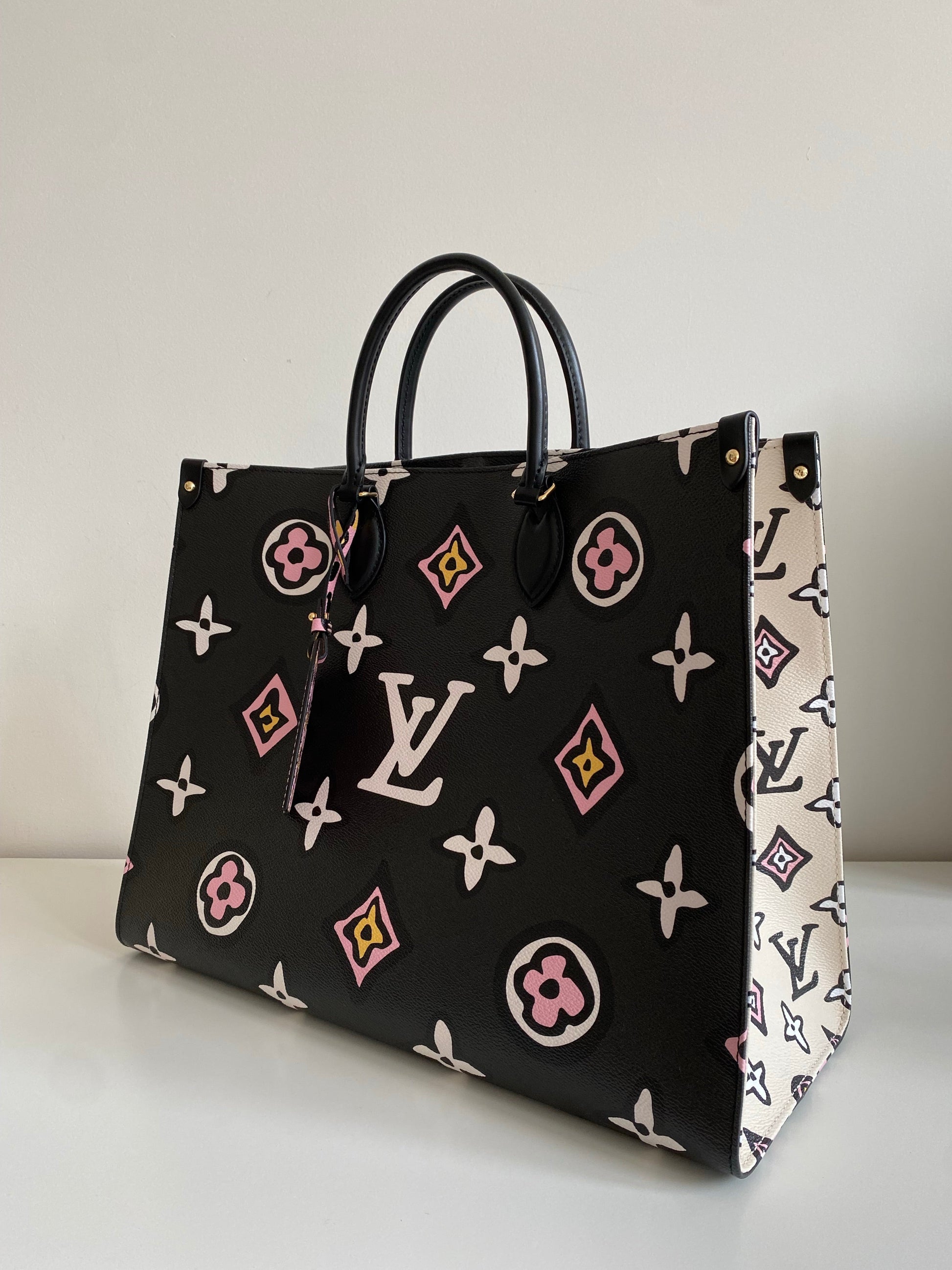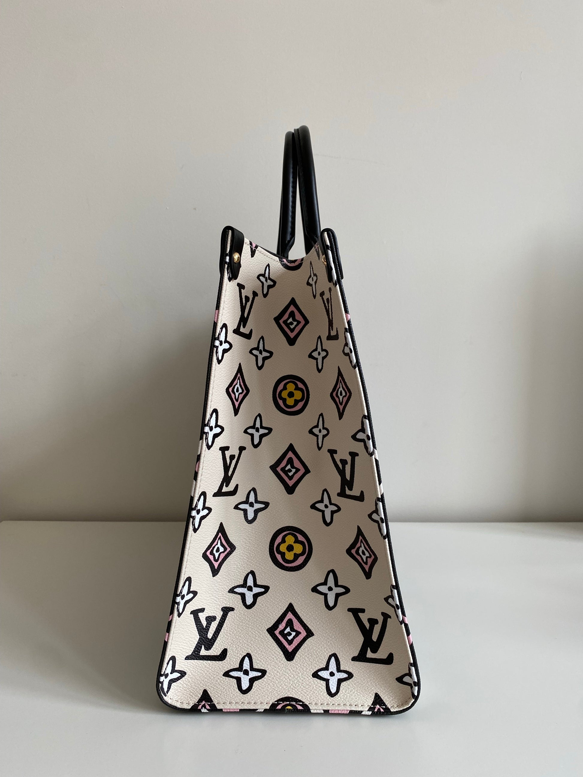 Characteristics: This Onthego GM carryall wears a graphic Monogram print this season, created especially for the Wild at Heart capsule. Inspired by an archival design, the pattern makes a striking fashion statement on this roomy tote, a stylish companion for business, shopping or travel. Long shoulder straps and twin Toron top handles provide several comfortable carry options.