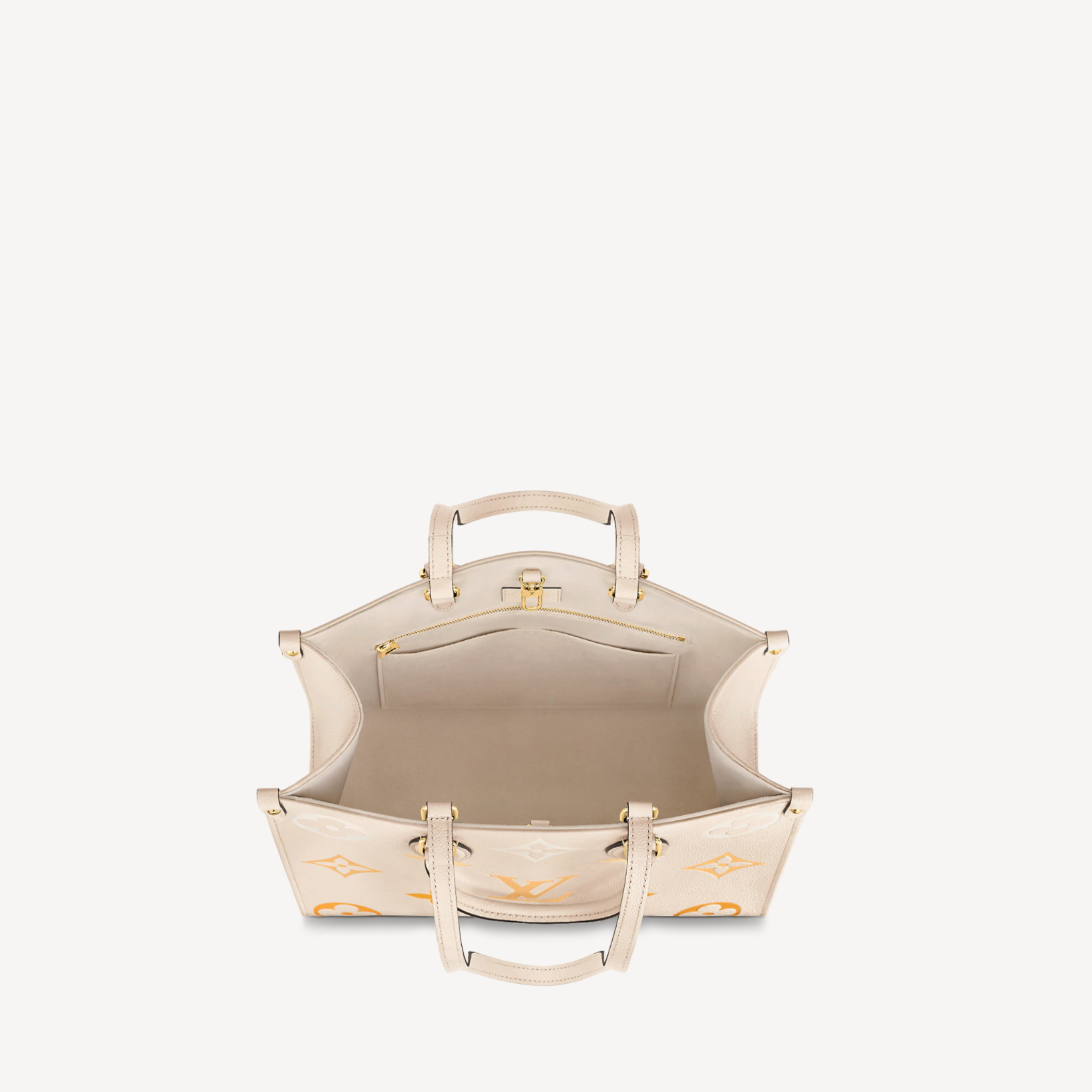 Made from a Monogram Empreinte leather with a subtle color gradient on the embossed Monogram pattern, the emblematic OnTheGo MM tote bag is part of the By The Pool capsule collection. It has two sets of handles, long and short, for hand and shoulder carry, and a spacious interior, which easily fits essentials such as a laptop. A leather charm gives a playful spirit and highlights the LV craftsmanship.