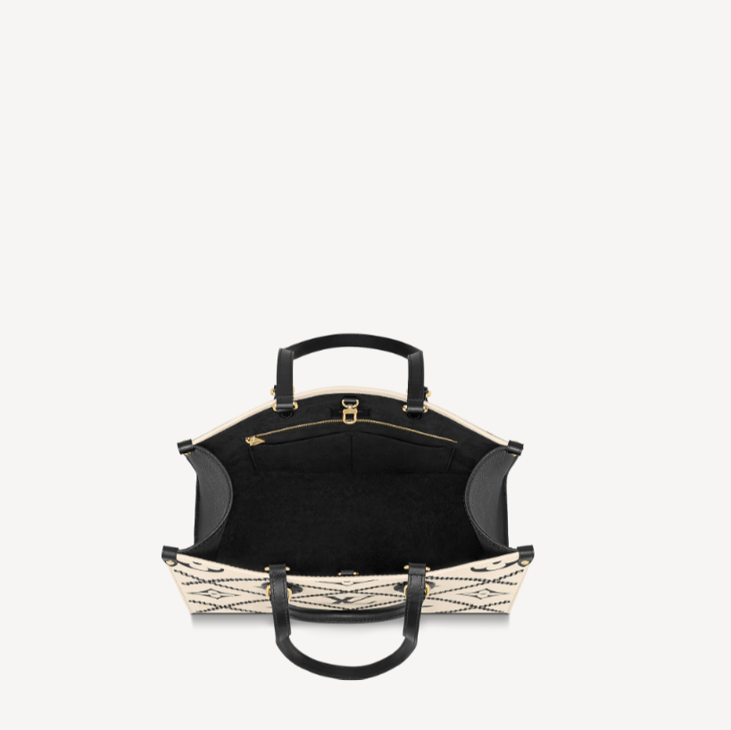 Characteristics: This Onthego MM carryall wears a graphic Monogram print this season, created especially for the Wild at Heart capsule. Inspired by an archival design, the pattern makes a striking fashion statement on this roomy tote, a stylish companion for business, shopping or travel. Long shoulder straps and twin Toron top handles provide several comfortable carry options.